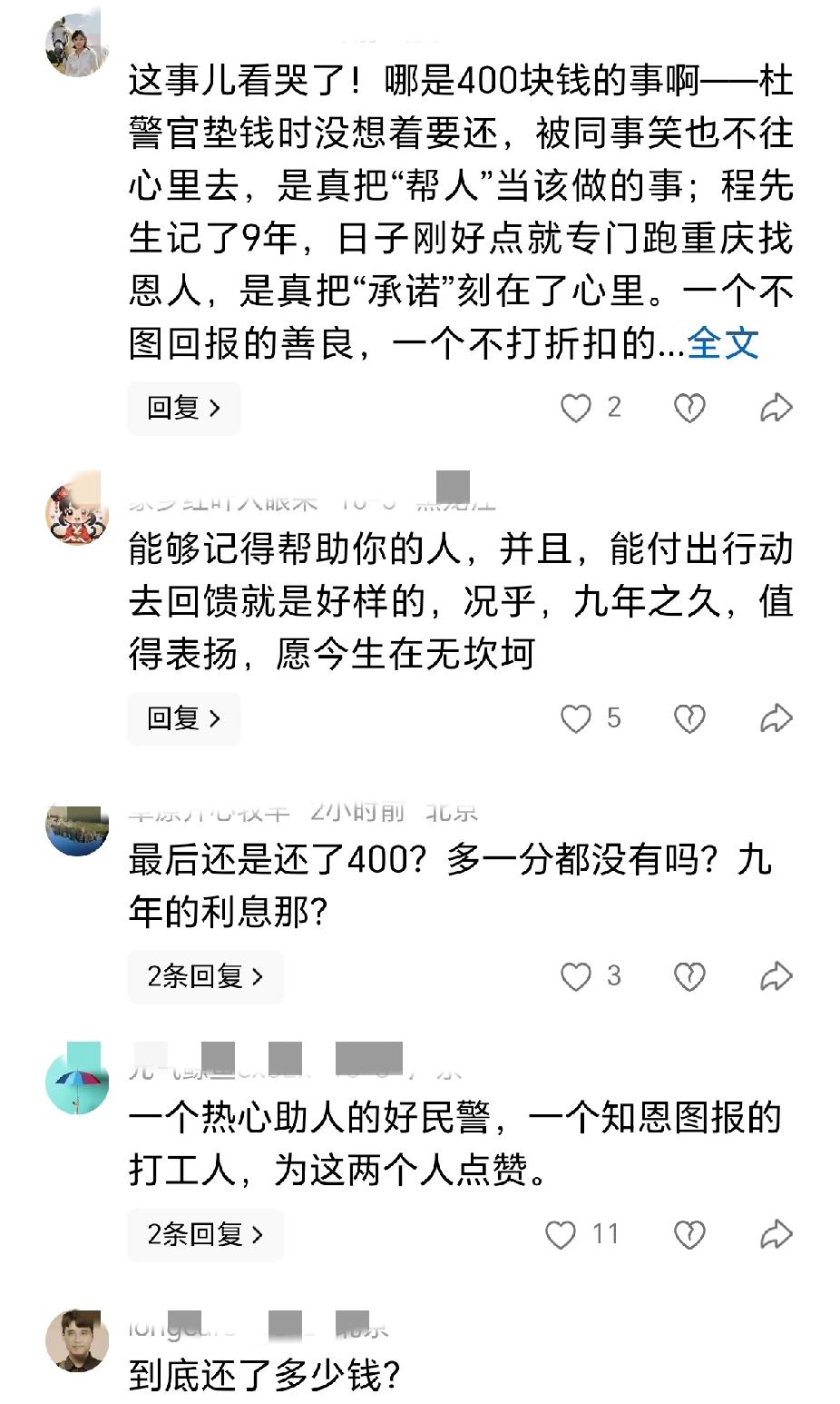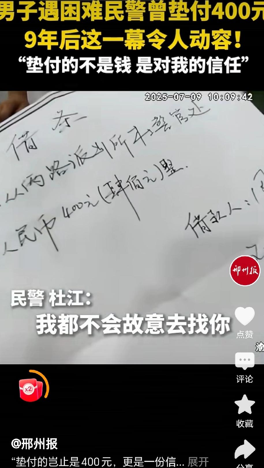 “动容了,民警9年前垫付400元,男子9年后前来兑现借条!”近日,重庆渝北,两路