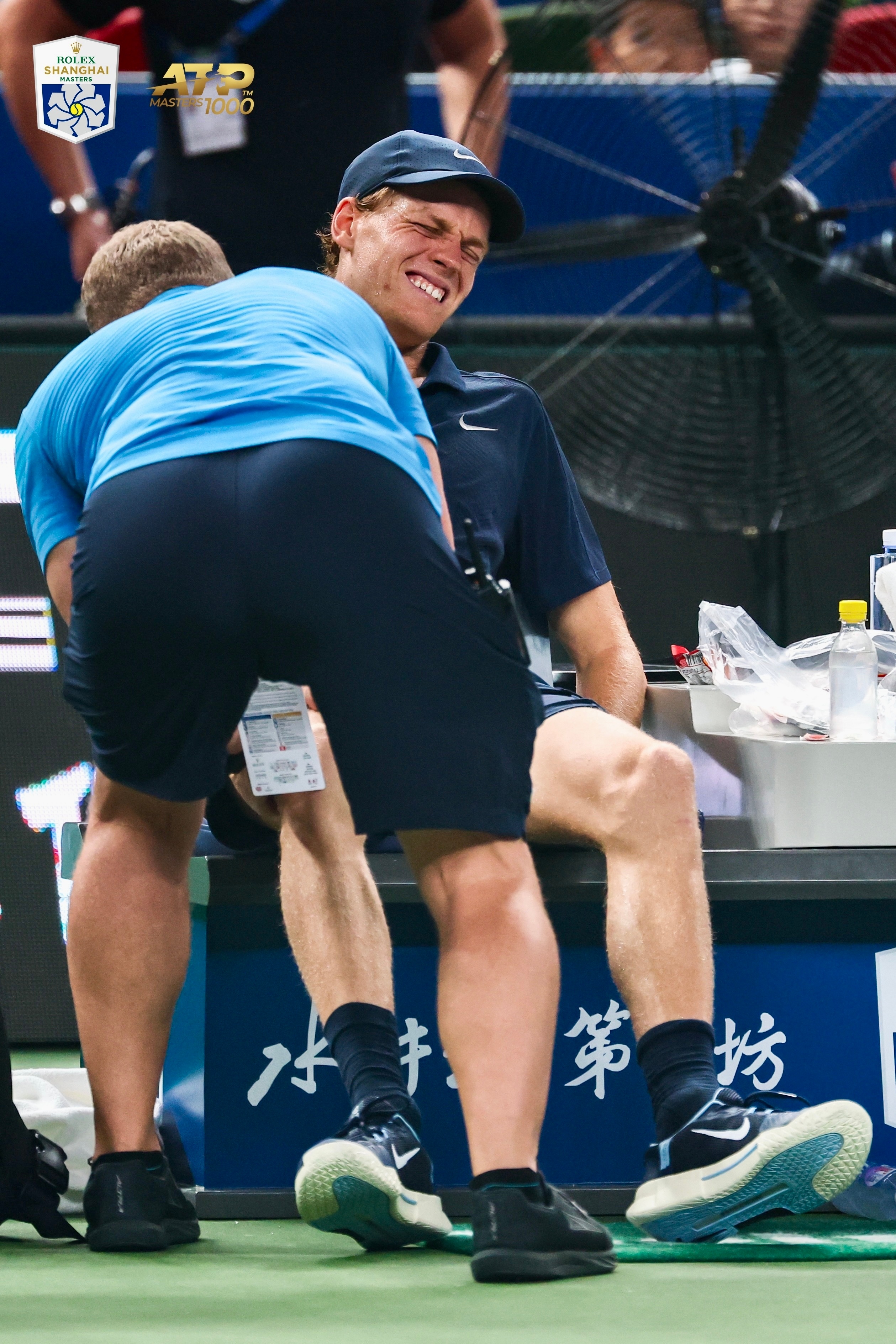 2025上海劳力士大师赛 在极端高温湿热的气候条件下进行着,开赛前没人想到已经十月了情况还会这样的严重。温度35度左右,湿度85%以上,能否承受几乎成为所有球员晋级与否的重要条件。于是,昨夜签表中排名最高来自欧洲的辛纳,在决胜盘中出现了大腿严重抽筋的状况,他只能手拄球拍像老人一样走下休息区,之后也选择了直接退赛。