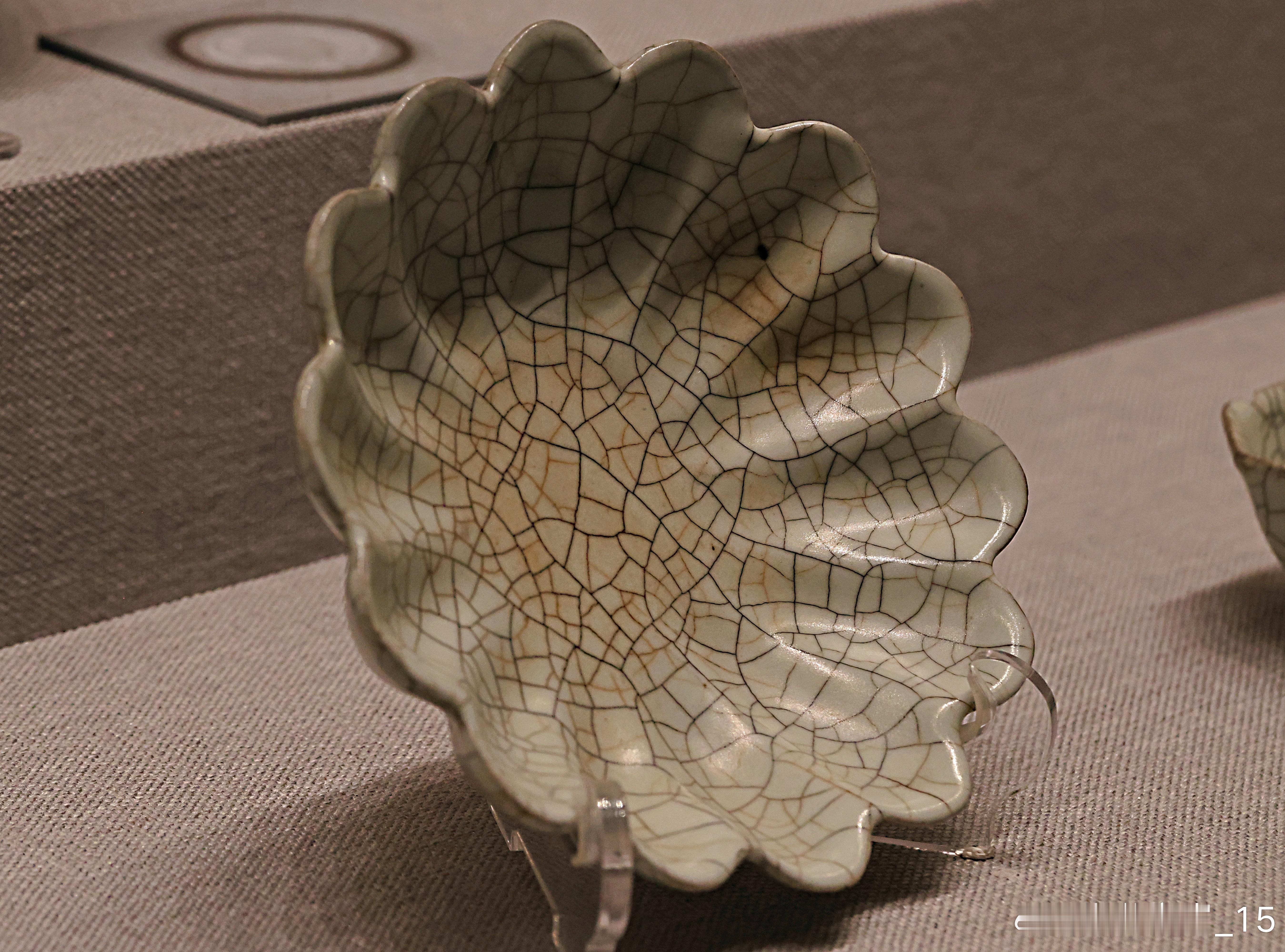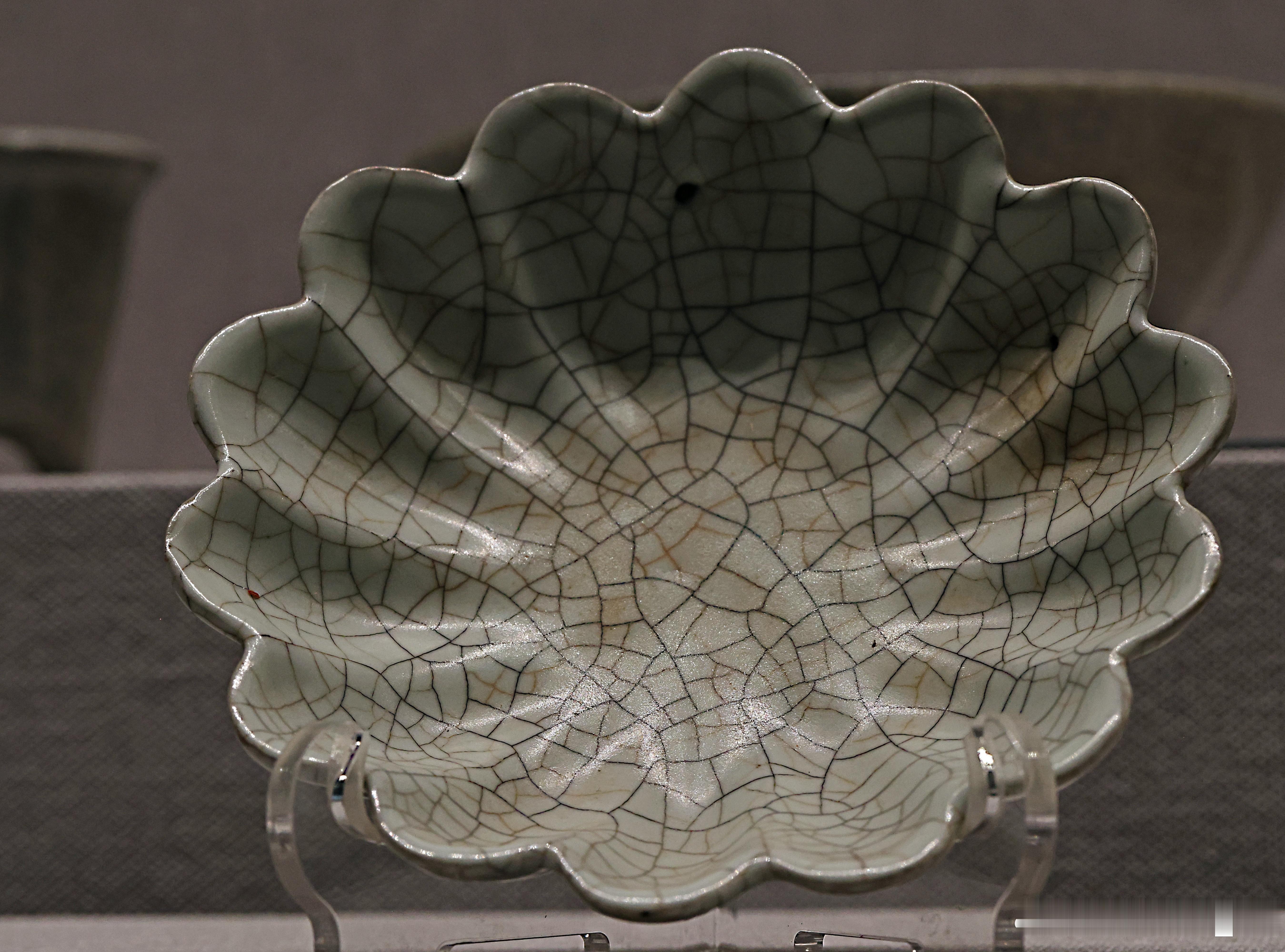 盘呈14瓣菊花形。敞口,浅弧腹,圈足。盘内、外和圈足内均施灰青色釉,釉面被“金丝铁线”般开片纹所分割。足端刮釉,露黑色胎。 中国古代艺术家和陶瓷工匠在设计陶瓷造型时,善于从大自然动、植物中获取灵感,蛙形、虎形、葵花形、菊花形等造型屡见不鲜。这件菊瓣式盘造型规整,青灰色釉素裹,交织如网的开片纹妙趣天成,堪称古陶瓷模仿花朵造型的典范。