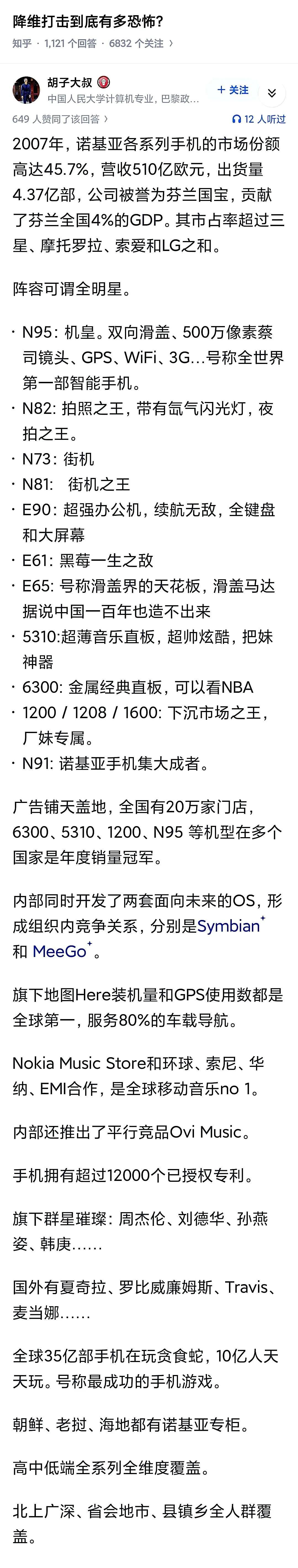 诺基亚背后没有强大的祖国啊! 你以为苹果若生在芬兰还会如同现在这么强大么?呵呵! 三星手机也是在股份大部分变成美国华尔街后才能行销全球的,你以为凭借韩国那个小棒子国就能支撑三星手机的地位? 你以为华为背后不是中国的话,华为能挺过美国的全方位制裁么? 诺基亚明明有实力却选择沉寂,应该是怕像东芝阿尔斯通华为那样被制裁吧,他们是很了解美国的…后来诺基亚更是干脆把CEO换成了美国人,这样应该明白了吧[捂脸] 自从微软去了个ceo,然后各种烂摆。诺基亚手机倒闭的时候员工就很郁闷,有句话说的是,我们没做错什么,就倒闭了。 不否认苹果手机很好,但很明显,仅凭这个不足以击败诺基亚,起码会有来有往。 但看看当年诺基亚的一系列蜜汁操作,根本不像是一个正常科技企业所为。完全就是要把苹果扶上马还要再送一程的节奏! 微软ceo把诺基亚弄倒闭后,部分手机业务和全部专利被微软收购,ceo回归微软继续做微软总裁! 这配方神似当初日本人牛的时候,韩国人啥也不是,结果美国人一看这不行,日本人翅膀硬了,于是一大波科技产业转到韩国,然后日本就成了现在的日本,韩国成了现在的韩国,收益最大的就是三星… 而苹果8开始,又有了竞争对手华为,然后美国又开始禁止销售华为,从x开始美国长臂管辖,全面打压华为。从12开始,全面制裁华为。一直到15华为才喘过气来… 可以肯定,没强大的祖国支持华为真的会被分解收购,成为美国企业!