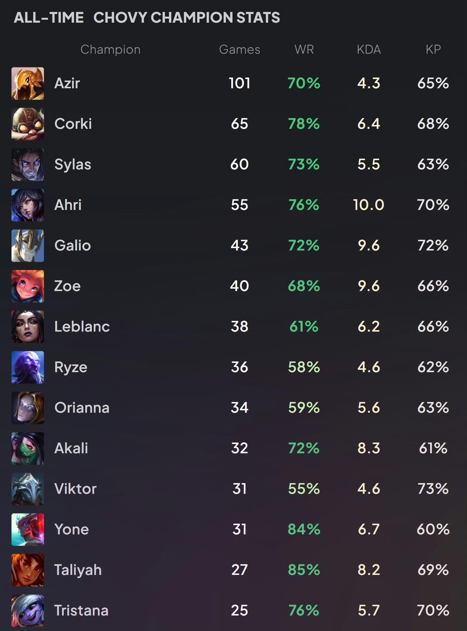 虎扑10月06日讯外媒统计Chovy职业生涯英雄使用情况,具体如下: