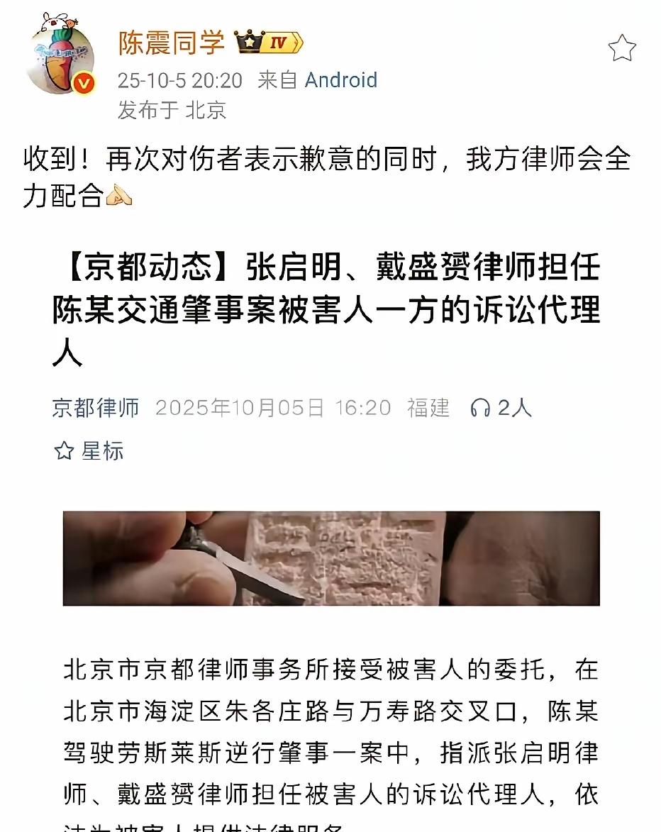 陈震回应伤者找代理律师,再次道歉并说自己的律师会全力配合,看来这事进入司法程序了