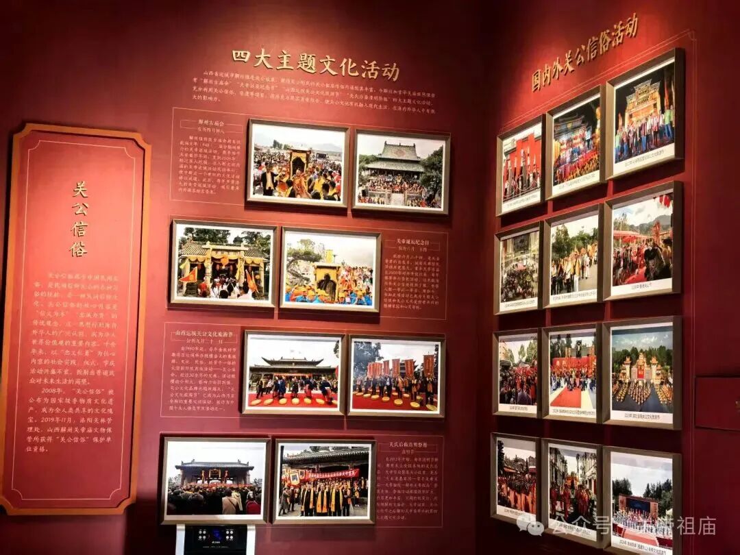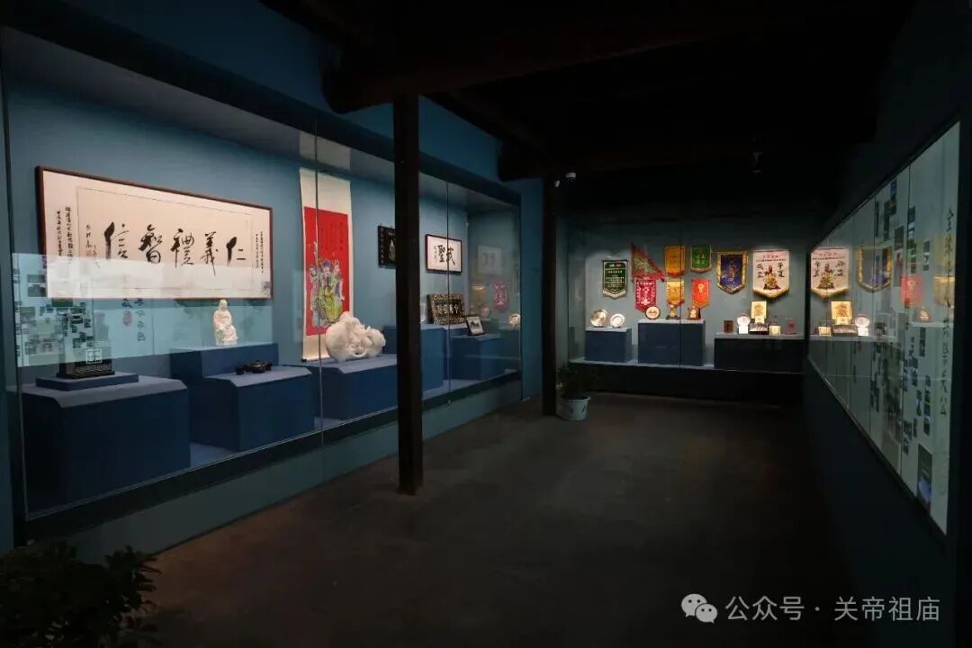 在解州关帝庙内的“全球关公文化交流展”展厅中,陈列有来自泰国、越南、印度尼西亚、新加坡、马来西亚、日本等国家的几十件实物,包括旗帜、瓷器、绘画、纪念章等,前后跨度40余年,记录了全球各地在关公文化交流中的符号印记。