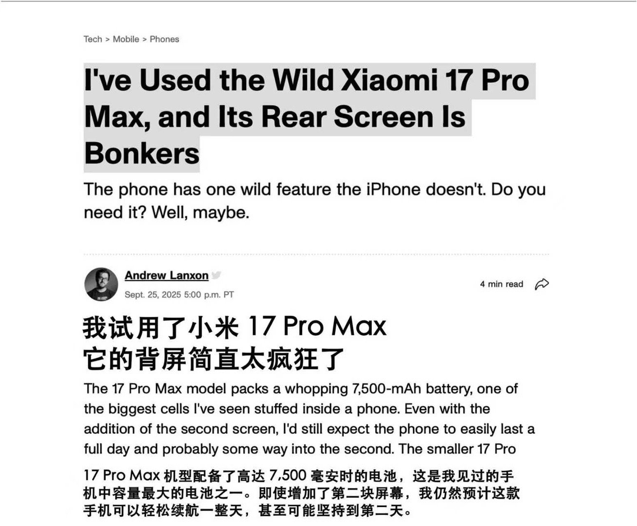 这款国货之光五天销量破百万,Pro Max占比过半,硬刚苹果不落下风,全系列销量较上代增20%。更火到巴黎时装周惊艳海外,国内外权威媒体齐点赞,小米17用创新书写现象级答卷。