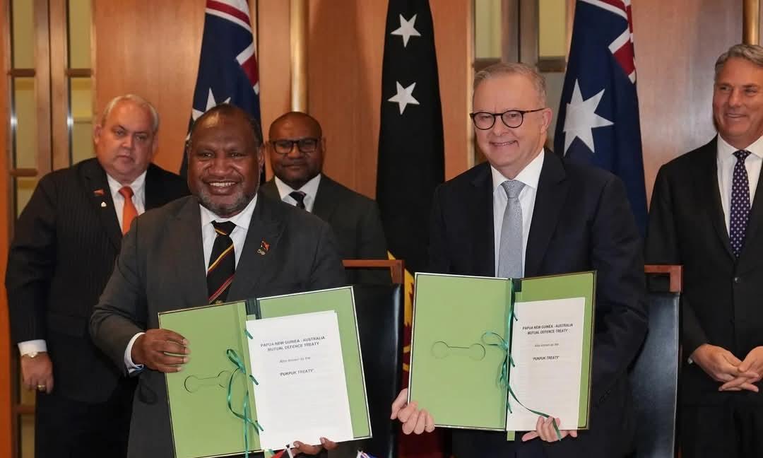 澳大利亚和巴布亚新几内亚今天签署具有里程碑意义的防务协议《鳄鱼条约》(Pukpuk Treaty),承诺在遭受军事攻击时相互防卫。 这是澳大利亚70多年来结成的首个新联盟,也是历史上的第三个。 巴新总理马拉佩形容该条约如同“一道更大的篱笆守护着两个相邻的房子”,并强调该条约与地缘政治和中国无关。