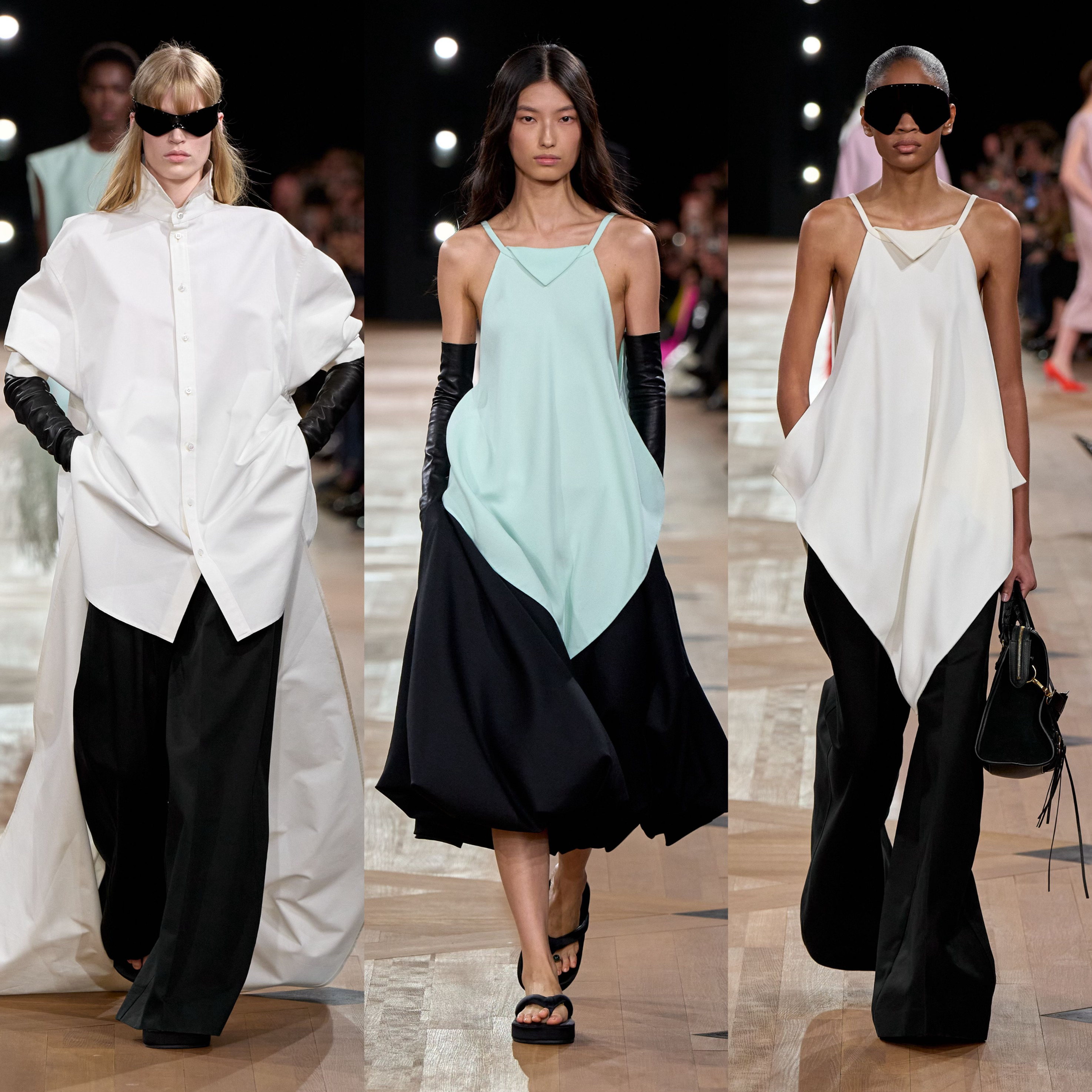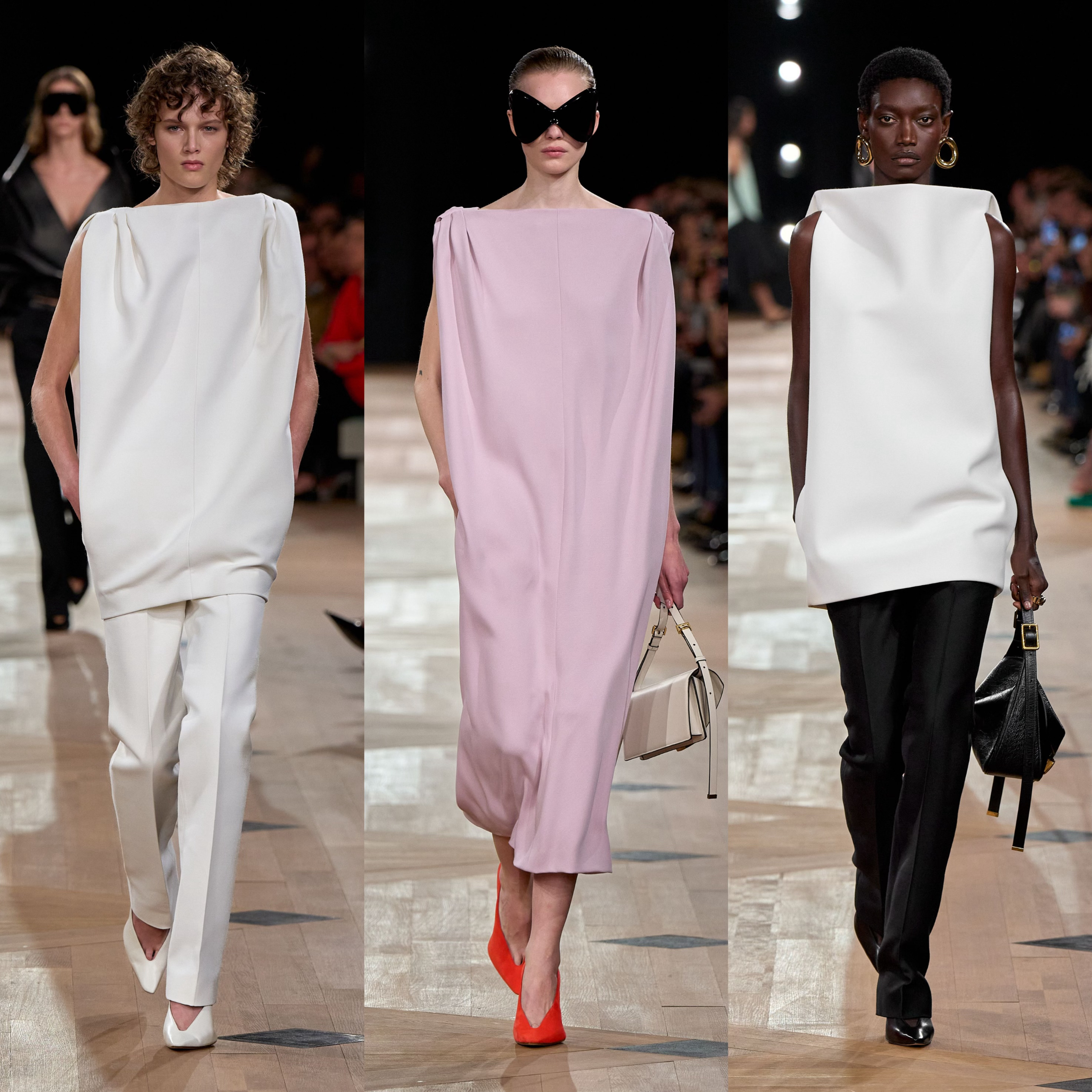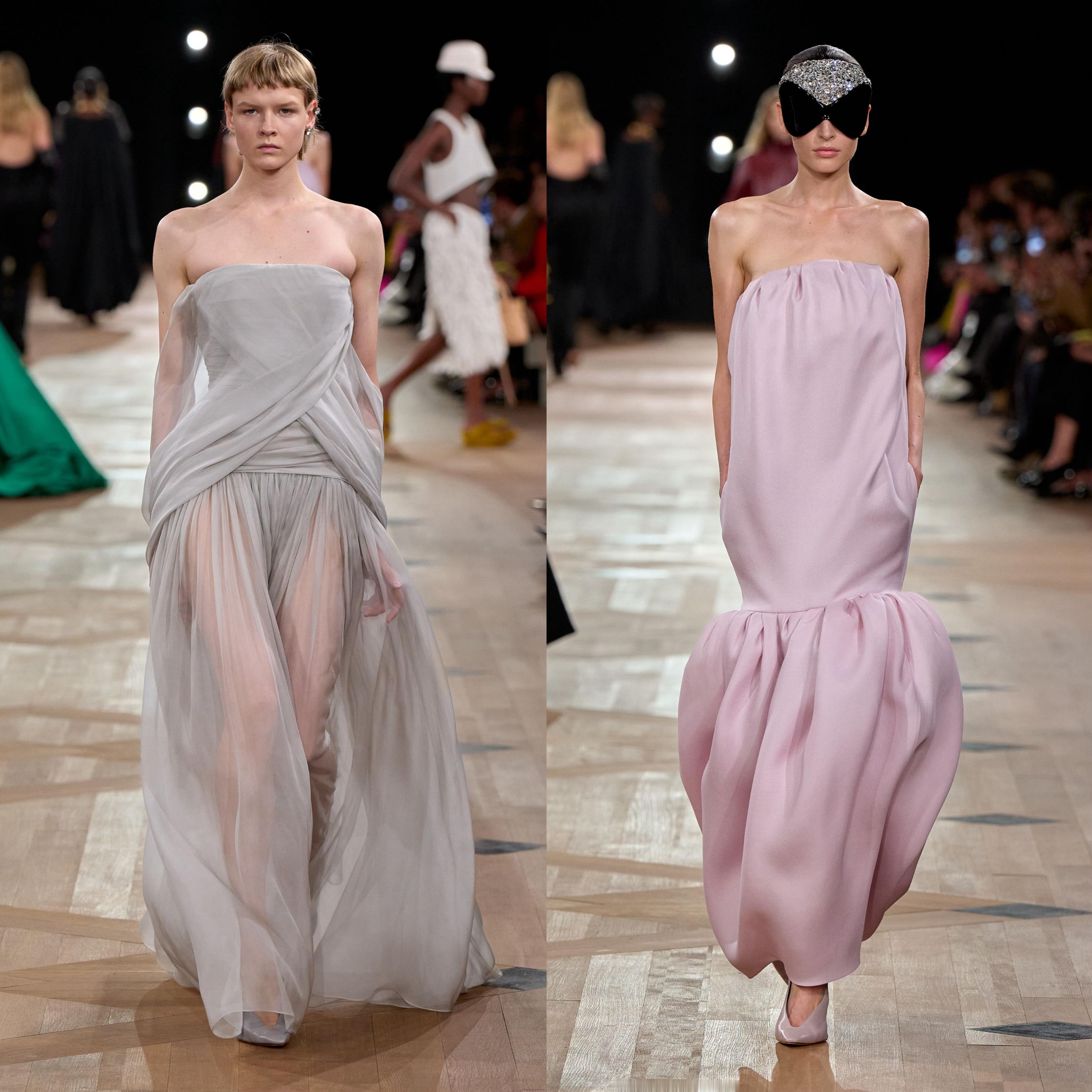 夏季26系列的核心突破,推出全新 NEO GAZAR 面料。作为 BALENCIAGA 最具代表性的面料,GAZAR 以双经双纬织法将两层织物融于一体,底层薄纱由不规则竹节纱制成,上层欧根纱则以连绵丝线赋予廓形支撑力与柔韧度,兼顾透气与流动。Pierpaolo Piccioli 在革新中保留外层可见的薄纱的薄纱效果,欧根纱层则融入丝线与羊毛混纺的纬纱,柔化硬挺、保留空气感与轻盈度,更契合高级时装的精准剪裁需求。品牌经典廓形Envelope Dress 四角形信封连身裙及Balloon Dress经典球型洋装以全新面料与当下设计语言赋予新面貌。