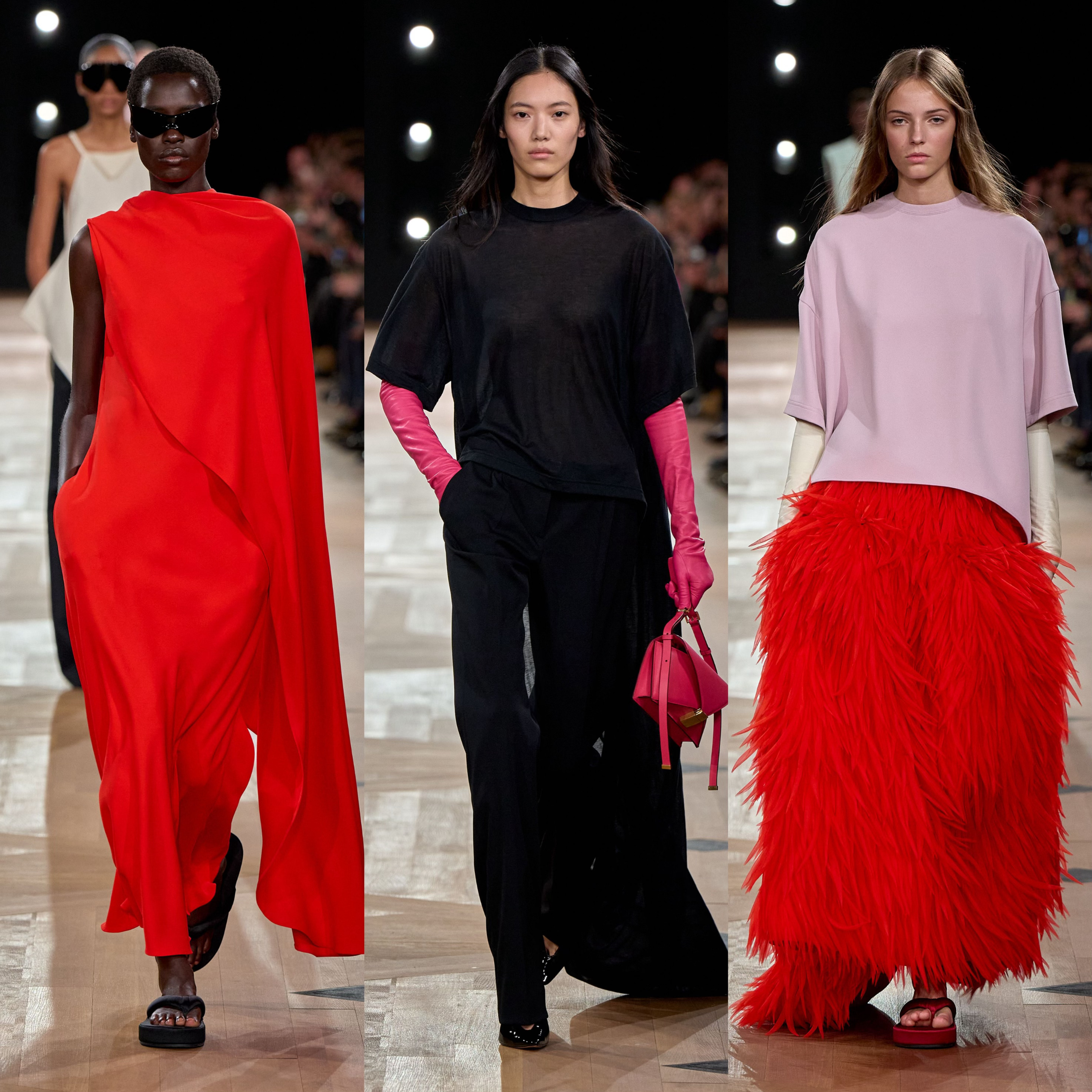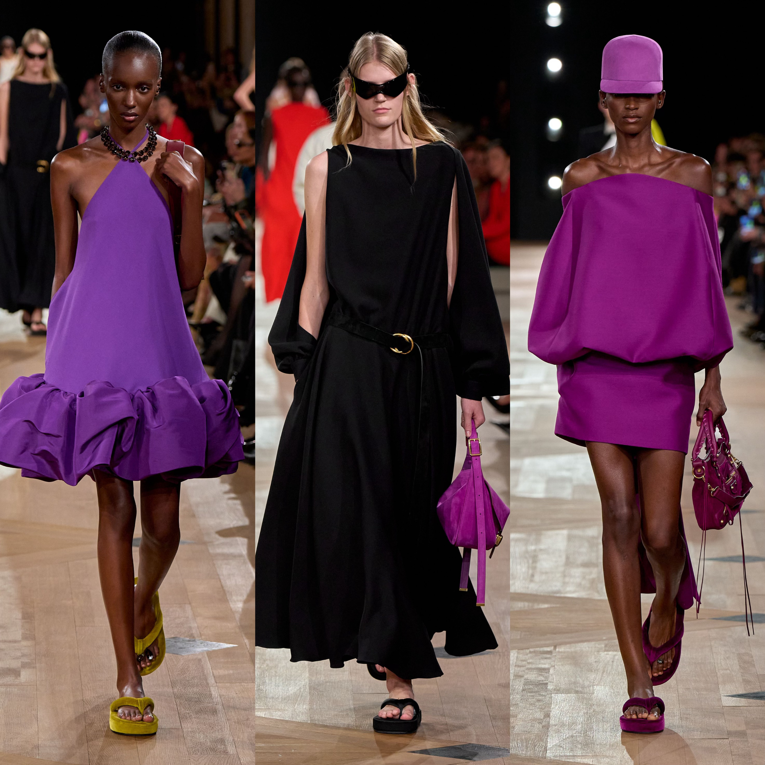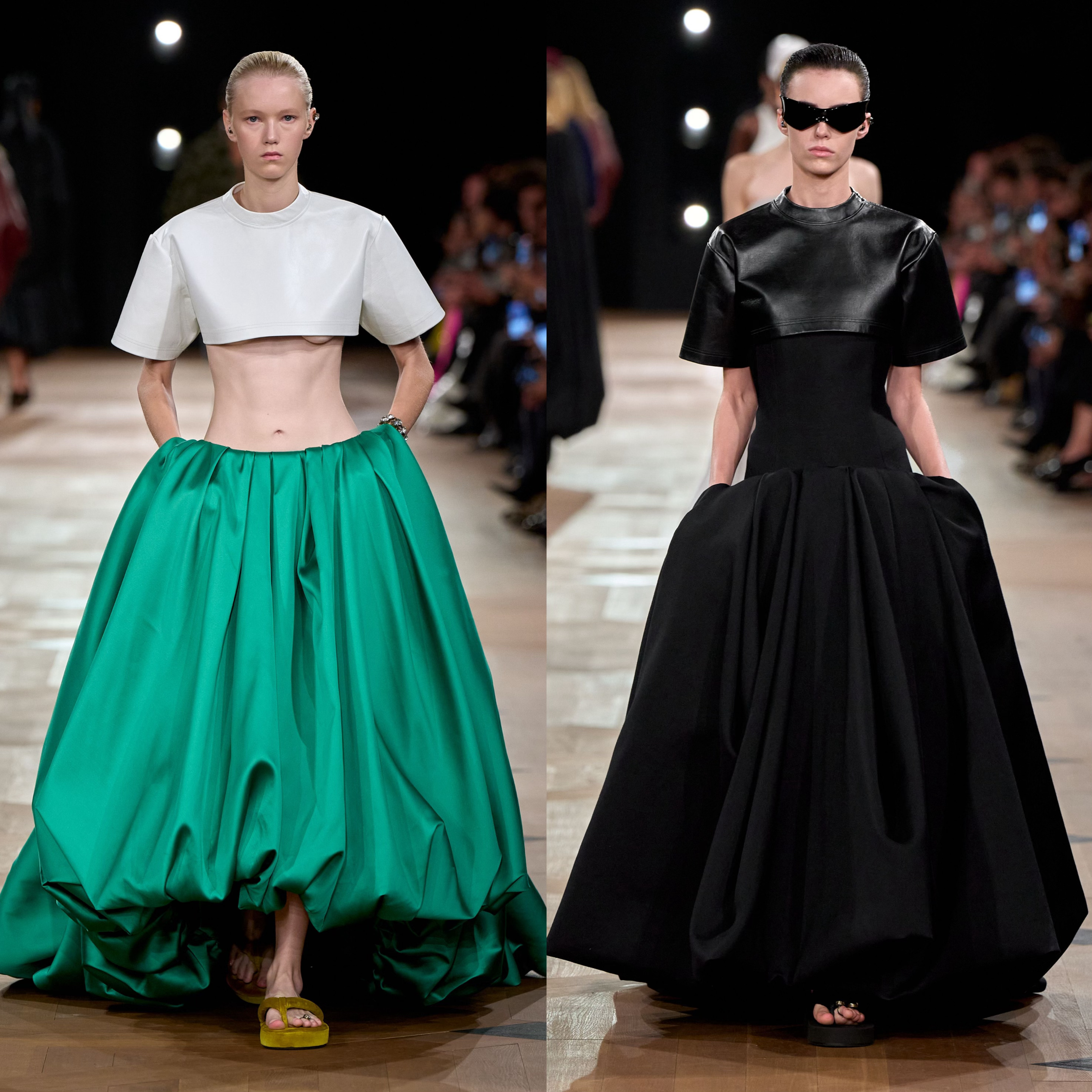 夏季26系列的核心突破,推出全新 NEO GAZAR 面料。作为 BALENCIAGA 最具代表性的面料,GAZAR 以双经双纬织法将两层织物融于一体,底层薄纱由不规则竹节纱制成,上层欧根纱则以连绵丝线赋予廓形支撑力与柔韧度,兼顾透气与流动。Pierpaolo Piccioli 在革新中保留外层可见的薄纱的薄纱效果,欧根纱层则融入丝线与羊毛混纺的纬纱,柔化硬挺、保留空气感与轻盈度,更契合高级时装的精准剪裁需求。品牌经典廓形Envelope Dress 四角形信封连身裙及Balloon Dress经典球型洋装以全新面料与当下设计语言赋予新面貌。