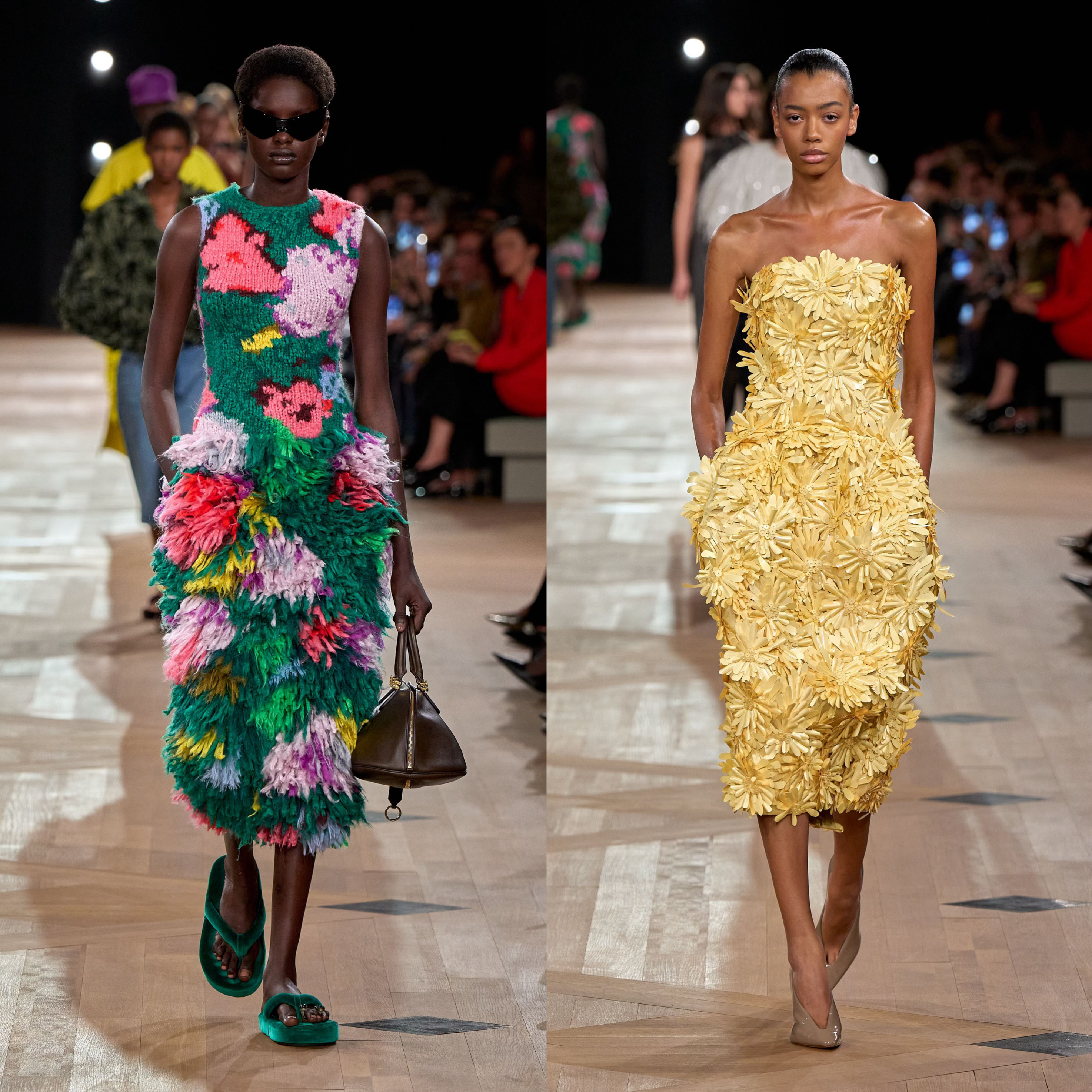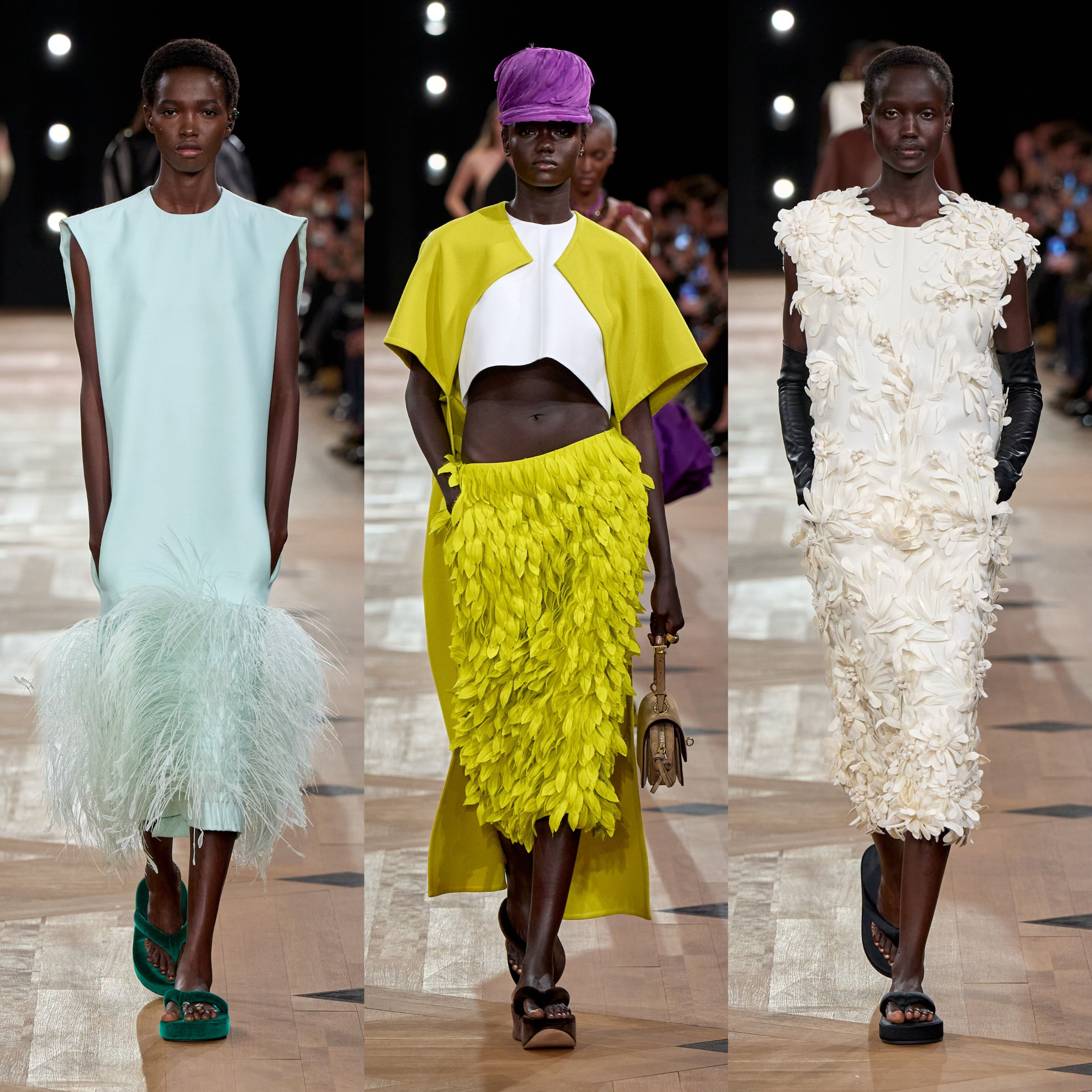 Balenciaga先生通过面料和设计重塑身体的廓形,让不完美变得完美。Pierpaolo Piccioli传承品牌基因,通过对长裙和短款上衣形状与比列的探索,皮夹克被解构重塑为斗篷状,花卉织物等设计呼应Balenciaga先生对建筑廓形与面料质感的把控。