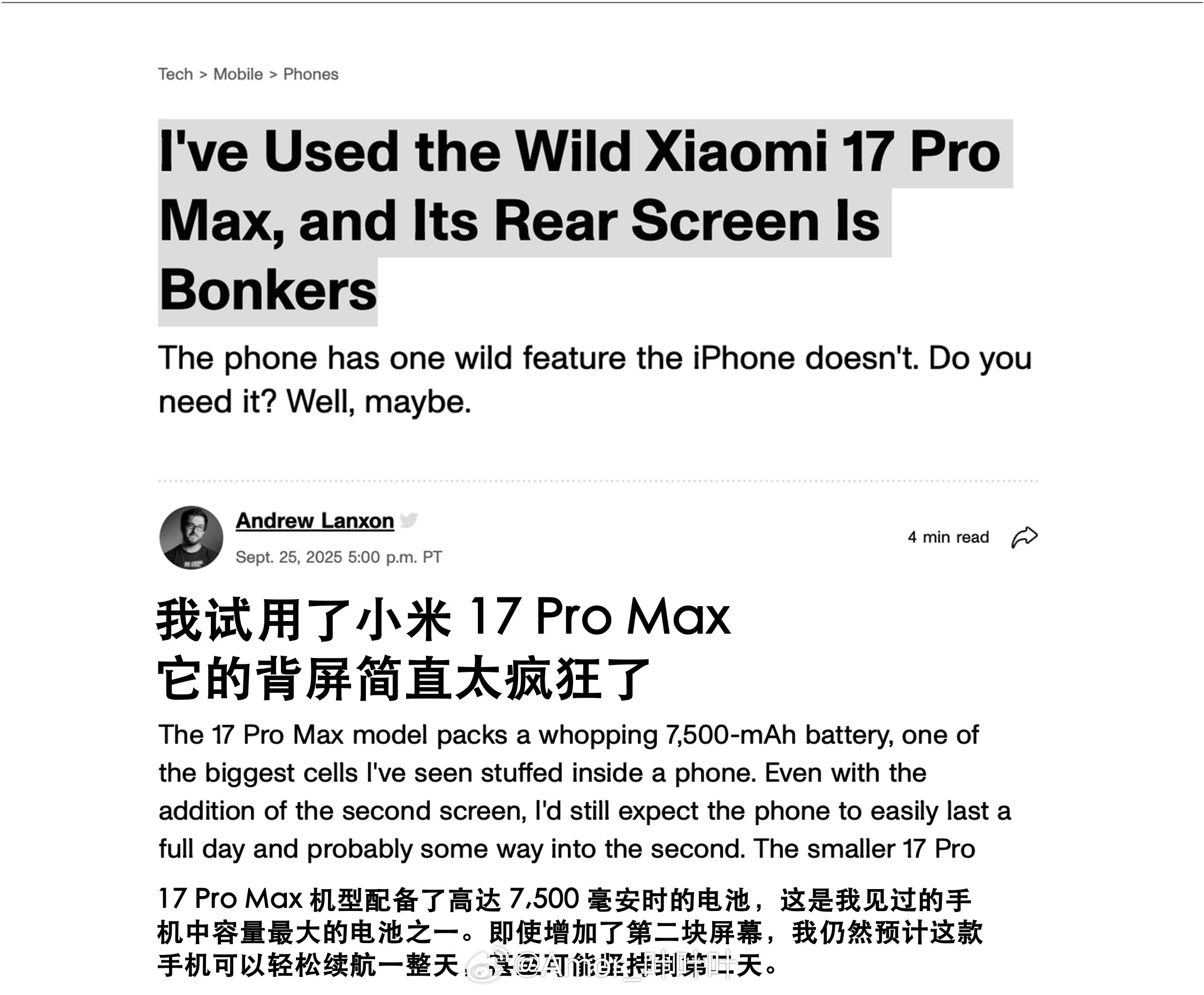 在这个手机行业“卷价格、卷配置”的时代,小米17反其道而行:不卷价格,卷创新。靠一块背屏,打出了差异化和技术自信。结果显而易见——上市五天销量破百万,全系列同比增长20%,更重要的是,这股热度已蔓延海外:小米17背屏设计亮相巴黎时装周,赢得海外设计圈掌声,外媒盛赞“中国制造正在重塑高端”!