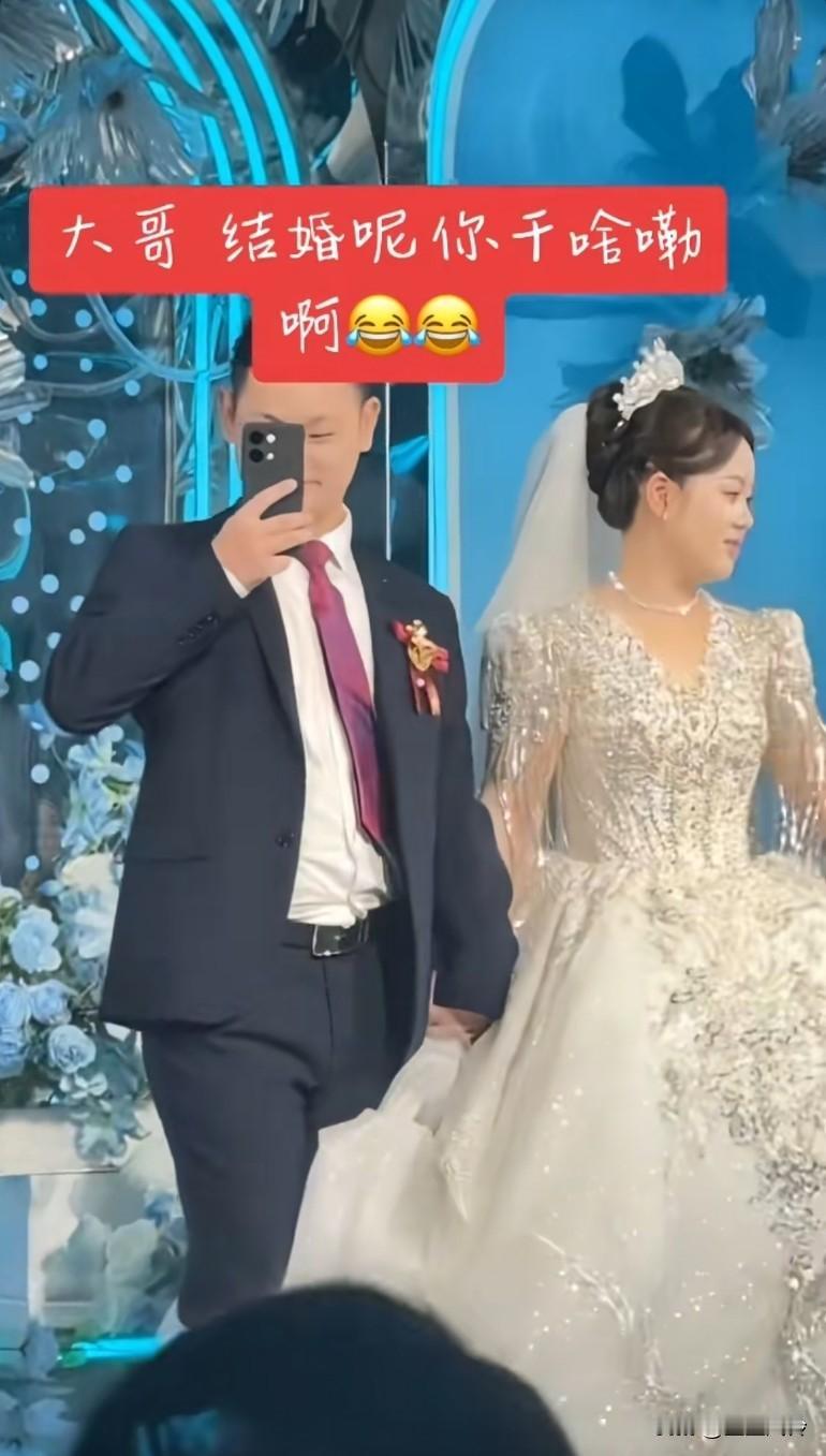 新郎: 好开心啊,终于结婚了,我要发朋友圈 一定要发,这新娘长的一副旺夫相 显眼包结婚的时候,也是显眼包哈哈哈哈哈哈哈。这谁家媳妇快来牵走,没人要我可就领回家了。自己结婚发盆友圈!最后大伙儿点赞的时候他才发现自己没有拍进去