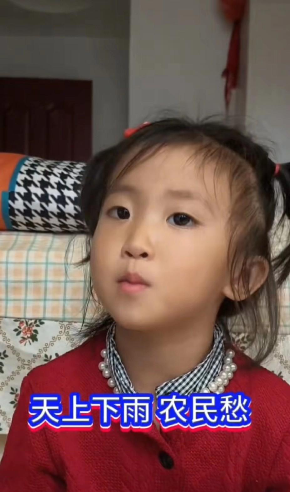 厅堂藏鼠辈,乡野卧麒麟!小满儿虽没有在大城市的早教中心启蒙过,但在 农村的父母却眼界高,从小就开始早教,别看只有三岁多,但读过的书涉猎广,唐诗宋词、传统文化诗句、毛主席诗词、以及儒释道……,不但能记住,关键还理解了,不但理解了,还灵活运用了,不但灵活运用了,还说的通俗易懂让我们获取知识,大为惊叹了![赞] 河南的雨在该收庄稼的日子里一直在下,下的人心慌和无奈。地里因为水多,别说机器进地收了,连人进去也陷的不好走,大片大片的玉米地只能滞留在田间,在玉米杆上都已经霉了,花生地也该收了,可因为这连绵雨,已经就地在发芽了!农民实在是太不容易了![流泪] 小满儿耳濡目染爸爸在田地的劳作,这天气她何尝不感同身受地理解庄稼人的无奈,心疼爸爸付出的汗水在收获的季节里马上付之东流,心里掩饰不住的痛惜中,就有诗涌出口: “天上下雨农民愁,秋雨缠田不肯走, 地里积水淹田头,玉米在杆想逃走, 花生烂在泥里头,等待老汉接家走, 奈何这雨没个够,机器无法下地收, 人工收割陷泥沟,哎呀,俺里那个爹呀, 蹲在地头皱眉头,一季汗水付水流!” 这脱口而出的打油诗,这对农民的感同身受,这广博的知识面,怎么能让我们不佩服?![赞] 熟读唐诗三百首,不会作诗自会吟!这个小满儿总是在生活的场景中,不但爆出名言金句,还会吟诗改诗来应景!一个没有人生经验和人生阅历的萌娃,却感觉像一个年老的智者。总是一语中的,让人在醍醐灌顶中叹为折服! 爱农村爱农民,更热爱脚下的热土。居庙堂之高则忧其民,处江湖之远则忧其君,哎!心疼这个三岁多的小萌娃,承担了本不该这个年龄应该承担的担忧! 这真是:农家孩子谙农事,赋诗咏叹咋秋收,丰收在望天不顺,也替老爹把心揪!不容易的农民啊![比心][心][玫瑰] #小满儿# #神童小满# #小满儿经典语录# #小满儿金句# #农民难#