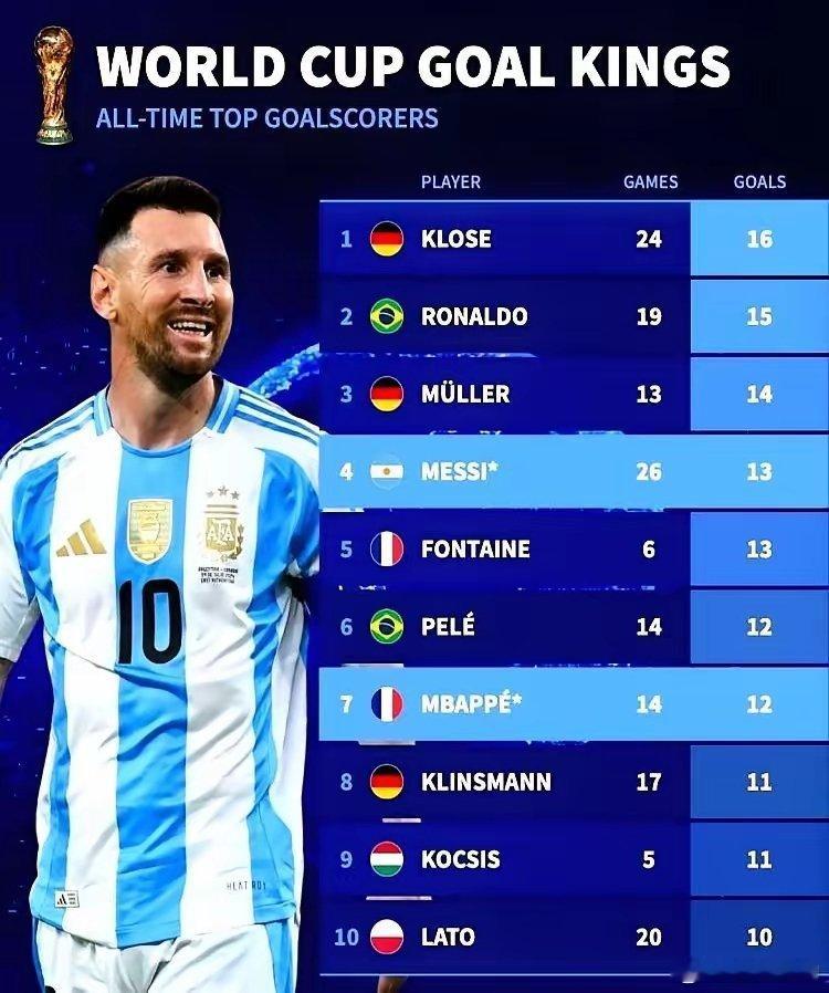 梅西快38了,还想着再踢一届世界杯,想追平克洛泽的16个进球。