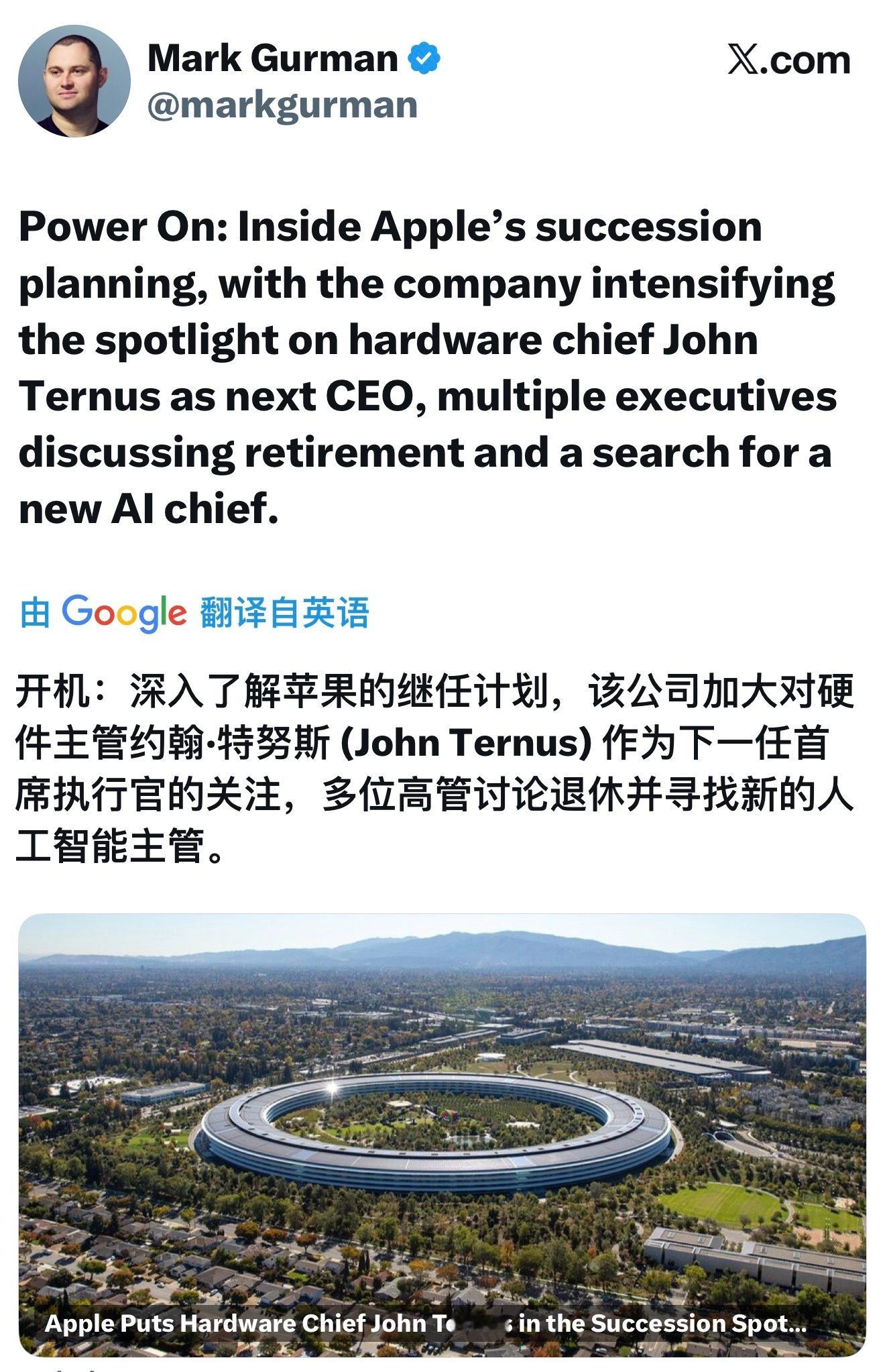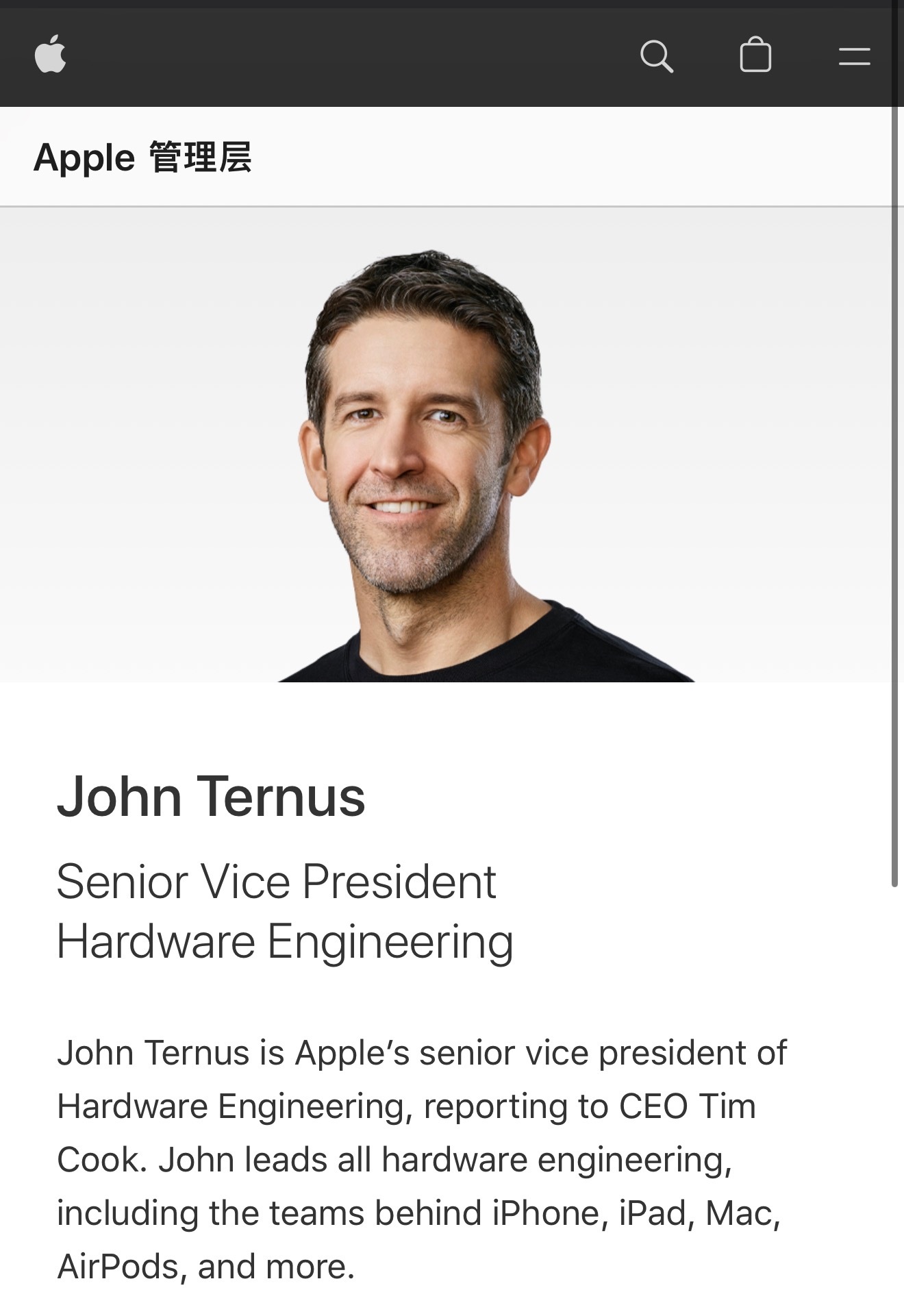 Tim Cook卸任在即,Apple的下一任CEO目前最热门接班候选人是John Ternus,其官网介绍显示此人负责Apple全线产品的硬件研发。