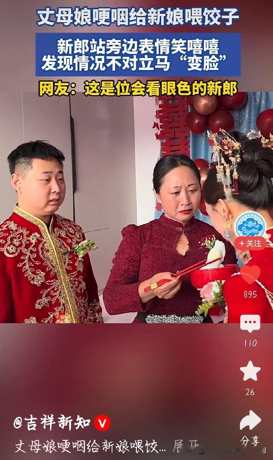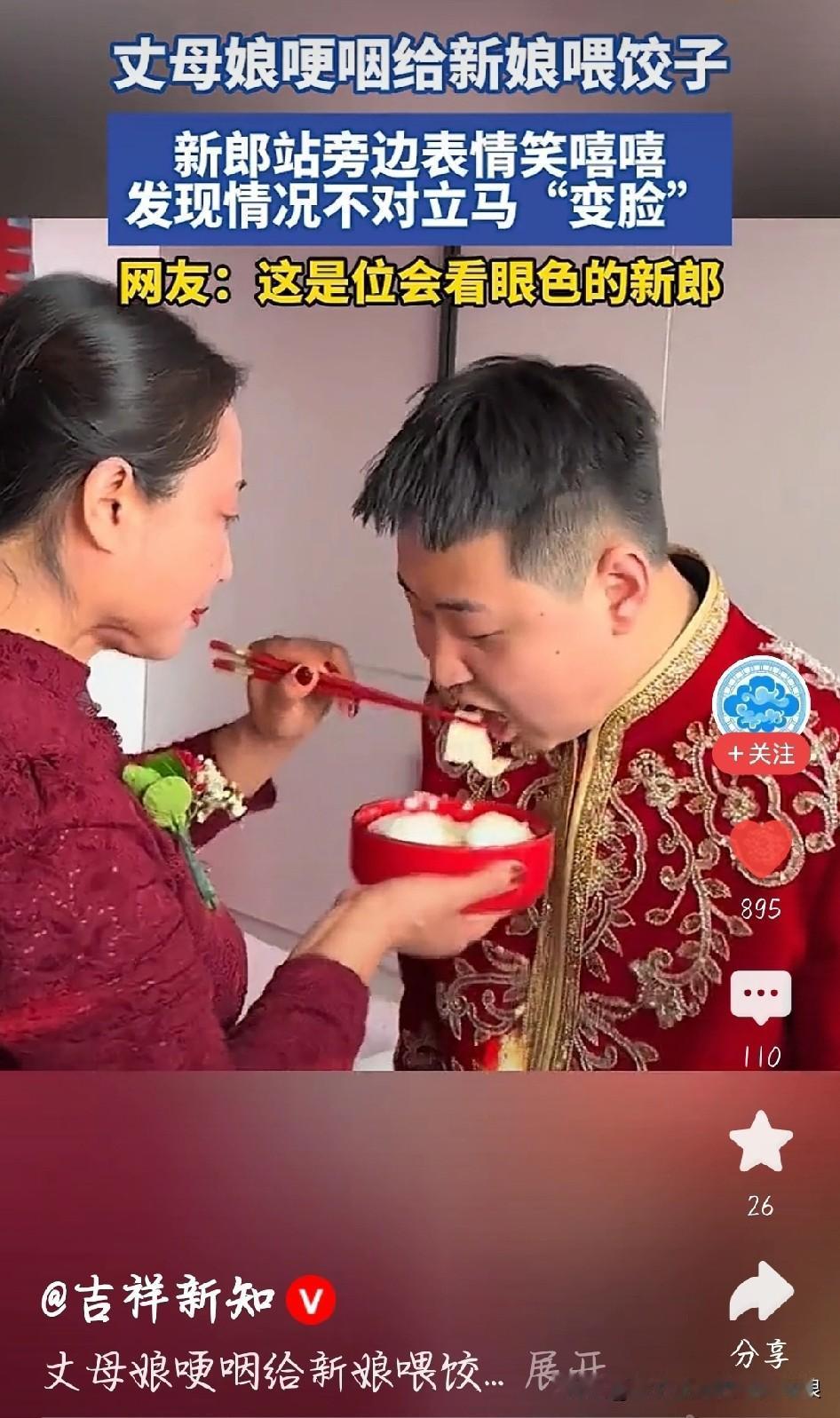 这婚礼上的一幕看哭网友!辽宁接亲现场,丈母娘端着子孙饺,颤巍巍给新娘喂第一口,刚开口眼泪就下来了,话都哽咽着说不完整。 旁边新郎本来还咧着嘴笑,瞥见丈母娘通红的眼眶、强忍着不舍的模样,脸上的笑容瞬间收了,表情一下变得严肃又心疼,眼神里全是体谅。 这饺子在北方婚俗里寓意着把闺女托付出去,丈母娘的泪是不舍,新郎的变脸是懂事儿。 网友都夸:这新郎有眼力见,能共情长辈的心思,以后指定错不了!细节见人品,这波真的太圈好感!丈母娘哽咽给新娘喂饺子新郎秒变脸 婚礼暖心一幕 婚宴感动瞬间