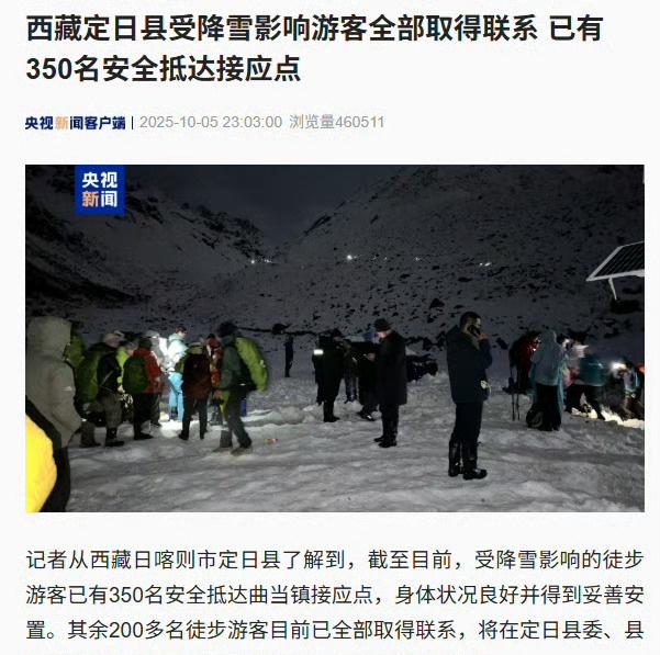 【西藏350名徒步游客安全抵达接应点】记者从西藏日喀则市定日县了解到,截至目前,受降雪影响的徒步游客已有350名安全抵达曲当镇接应点,身体状况良好并得到妥善安置。其余200多名徒步游客目前已全部取得联系,将在定日县委、县政府组织的相关人员引导帮助下,陆续抵达接应点。(央视新闻客户端)