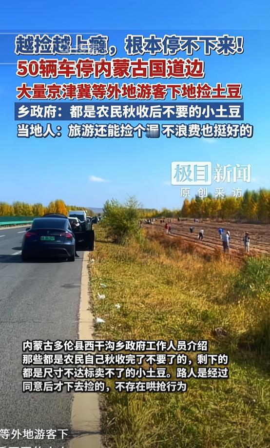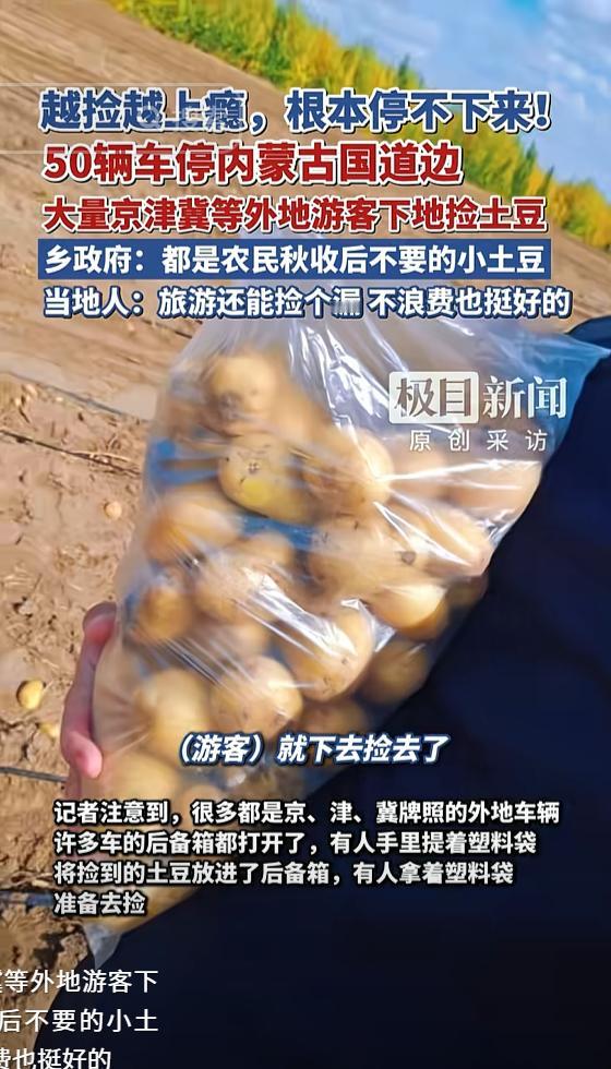 捡漏了!男子一家三口去内蒙古旅行,竟然跑到别人地里捡土豆,主人家发现后,不仅不阻止,还拿出编织袋让他们随便捡,男子这才知道,地里都是主人家不要的小土豆,其他游客也加入捡土豆大军,网友:根本捡不完! 10月5日,张先生一家旅游归来,回家路上,看到内蒙古当地的土豆大丰收,农民正在地里捡土豆。 奇怪的是他们只挑大的,还有无数小土豆留在地里,张先生一问才知道,小土豆是不要了,留在地里当肥料,如果喜欢,可以免费捡。 张先生已经买了两包大土豆,一听还有免费的,当场下车开始捡土豆,没一会,过道上停了几十辆车,游客们都下车捡了起来。 农民一看捡土豆的人多了,又拿出厚厚一叠编织袋,给游客们分发着:“拿袋子捡,多装点!” 有了编织袋,张先生捡的更起劲了,没一会,小土豆也捡了两大编织袋,开心的背上了车。 别的游客也收获颇丰,大家脸上都是丰收的喜悦。 张先生还有意少捡了点,想让后来的游客也有同样的惊喜。 当地乡政府得知“捡土豆”火了,还回应了此事,这些都是不要的小土豆,因为尺寸没达到售卖的标准,被落下的,游客们捡走也没啥。 对游客们来说,能有这样的收获,比旅游还开心! 当地农民太朴实了,这些土豆让游客随便捡,既避免了浪费,也让游客更开心,游客又多了一份不一样的体验。 有网友称,这在当地很常见,一般叫“落土豆”,主人家收完就可以去捡了。 这次就有点不一样了,游客们参与了进来,用自己的劳动捡来的,回去吃起来,想必比买的更香。 当地种土豆的农户那么多,之前丢弃掉的小土豆应该也有很多,一次无意中的大方举动,竟成了解决这种低价值农产品的最好方式。 将这些土豆分享给路过的游客,让大家带回家,比直接烂在地里强多了。 张先生满载而归的时候,已经对内蒙古留下了深刻的印象,等到明年秋天,说不定还会回来捡土豆,这种大大方方的举动,无疑又给内蒙古宣传了一波,获得游客的好感。 游客的行为也不是贪心,他们有的人已经买了,捡拾土豆时,也是获得了准许的,甚至还为后面的游客留了余地,这种分寸感,让捡土豆的快乐又多了一重。 对张先生来说,这次印象最深刻的,也许不是哪个景点,也不是哪块草原,而是这块热火朝天的土地。 他们也当了一把土豆大户,体验了收获的喜悦,农户主动给他们提供袋子的时候,那种热乎劲,比什么都重要。 旅行的本质,不就是离开自己熟悉的地方,到陌生的环境,遇到更多温暖的人吗? (来源:极目新闻 2025年10月6日 50辆车停在蒙古国道边,大量京津冀等外地游客下地捡土豆,乡政府:都是农民秋收后不要的小土豆;当地人:旅游还能捡个漏,不浪费也挺好的)
