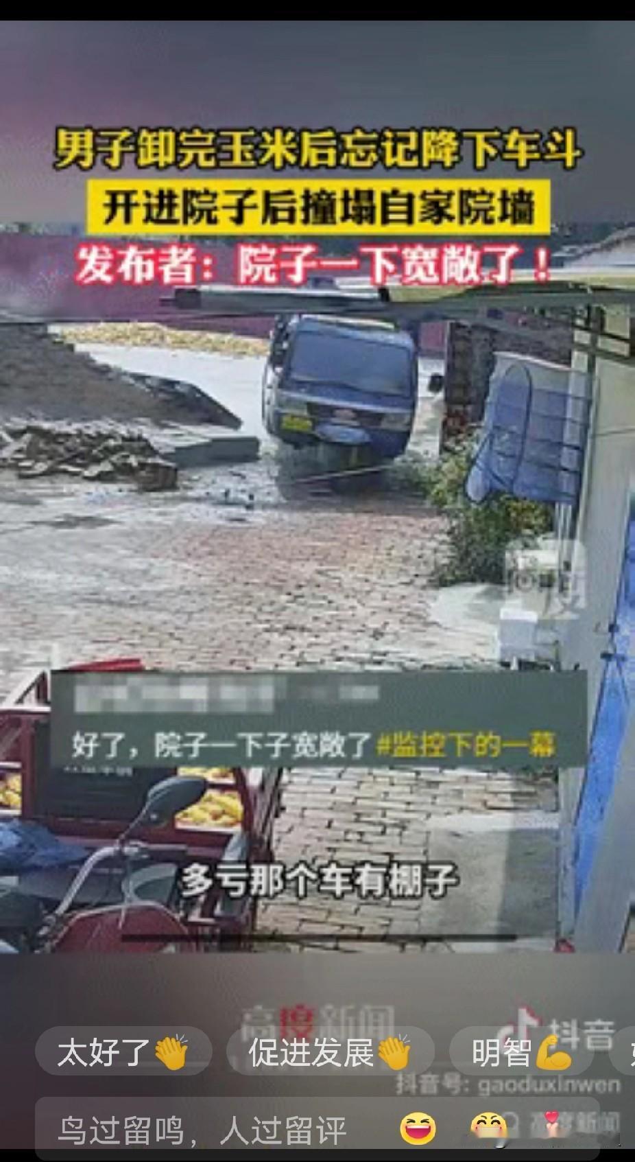 “忍不住笑了!”山东德州,男子急冲冲卸了一车玉米,结果因为忙晕了忘了把农用三轮车的车斗降下来,就这么高高翘着往家开,结果车头刚进院门,后头升起的车斗“哐当”一声直接怼上了院墙。砖头瓦片哗啦啦往下掉,眨眼功夫院墙塌了,小伙只好自我安慰:院子一下宽敞了! 小伙看着眼前的一片狼藉,愣了几秒钟,反而噗嗤一声笑了出来。这场景让他想起村里流传的那些关于马虎司机的笑话,比如那个口吃同事帮忙倒车,一直“dao...dao...”地喊,结果司机光顾着听指令,愣是把墙给撞倒了。还有那个坐在货车斗里打盹的老乡,司机卸沙时忘了车上还有人,直接升起车斗,老乡爬出来时还一脸愧疚地对司机说:“对不起啊师傅,我不小心把你的车给踩翻了”。他挠挠头,自己今天也成了这类笑话的主角。 这种忙中出错的尴尬事儿在生活中还真不少见。就像山东德州另一位货车司机,一路开到目的地都没发现丢了一件货,正着急上火时,后面追上来的小车司机乐呵呵地喊道:“哎呀,这个司机找不到了,这司机找不到一件货!”原来这位好心人捡到货物后追了一路,用这种“幸灾乐祸”的方式完成了物归原主。面对这种让人哭笑不得的局面,幽默感就成了最好的解药。当年民主德国的乌戴特将军被年轻士兵不小心泼酒在秃头上,他轻抚士兵的头说:“老弟,你以为这种治疗有用吗?”一句话就让全场紧绷的神经松弛下来。美国总统奥巴马被女生的酸奶泼到裤子时,也是开玩笑说:“这下你可有故事讲了”。 小伙那句“院子一下宽敞了”的自我安慰,透着股山东汉子特有的实在和豁达。他没急着抱怨运气差,反而在废墟里找起了乐子。这种乐观劲儿让人想起那些调侃撞车的幽默句子——“我的车子有一种特殊的功能,就是能够自动识别附近的障碍物,并精准地撞上它们”。虽然墙塌了是件麻烦事,但至少人没事,而且往后院子里进出大件东西倒是真方便了不少。 这种化尴尬为趣事的本事,其实体现了老百姓的生活智慧。就像《披荆斩棘》节目里齐思钧遇到道具剑折断的意外,他没有慌张,而是用一串成语接龙巧妙转移了注意力,反而成了节目亮点。生活中难免有措手不及的时刻,与其纠结损失,不如学着用幽默的眼光重新打量局面。 各位读者你们怎么看?欢迎在评论区讨论。