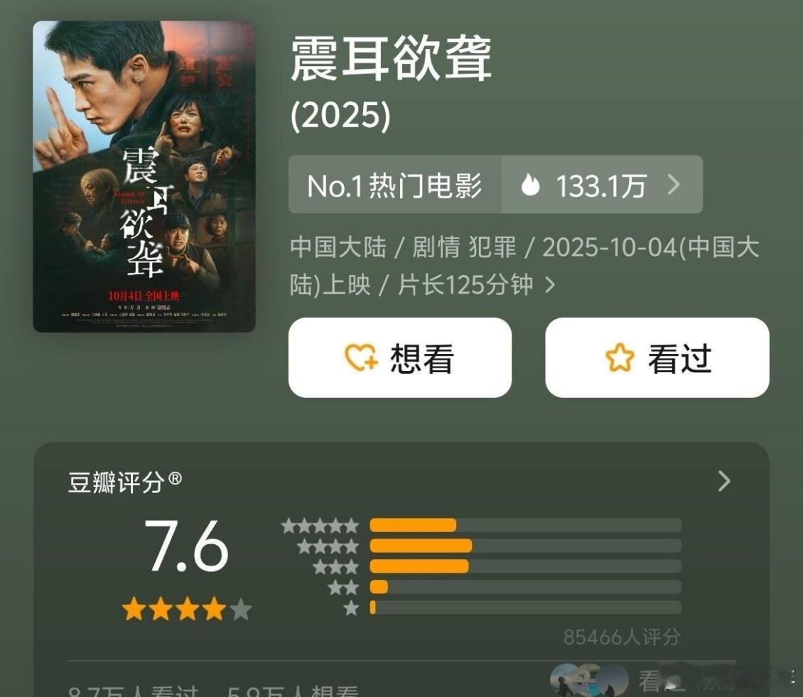 檀健次主演的《震耳欲聋》豆瓣开分7.6分,目前票房是1.25亿,你看了这部电影吗?