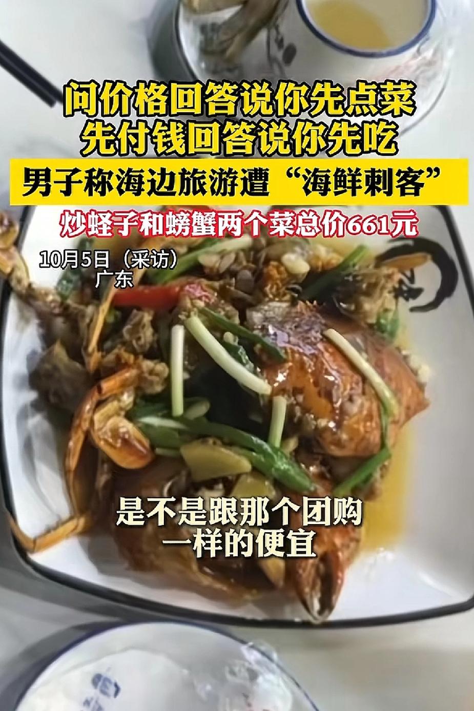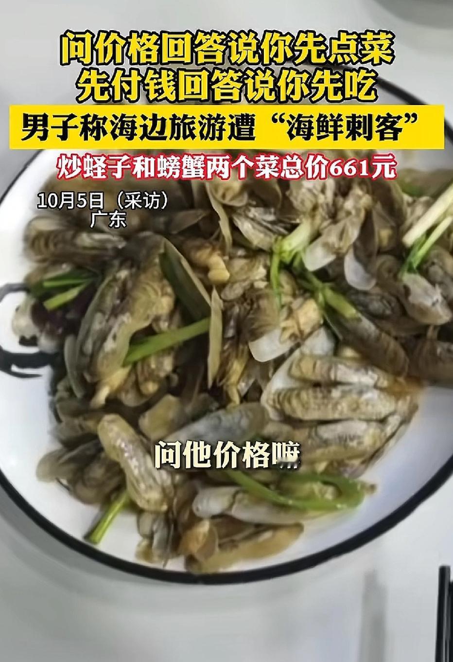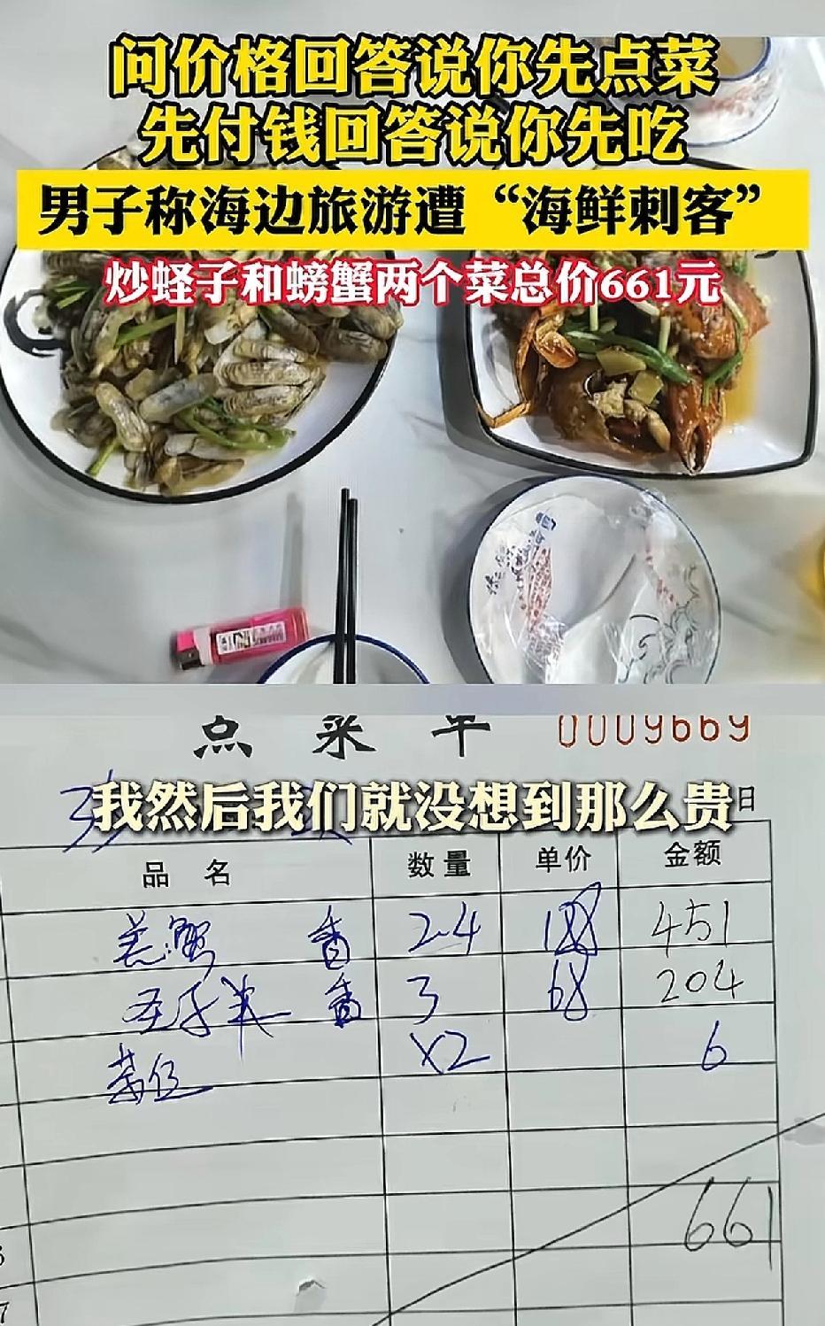 旅游期间,你是否遭遇过“海鲜刺客”呢?在广东海边,有游客走进一家小饭店,询问海鲜价格,还问是否和团购一样实惠。 老板说:“团购时间过了,你先点菜,价格稍后再说。” 游客点了一盘炒蛏子、一盘炒蟹,还有两碗米饭。 饭菜上桌后,游客又询问价格准备结账,老板却道:“你先吃,吃完再结账。” 游客用餐完毕,老板拿来的账单让他们大吃一惊。 两盘海鲜加上两碗米饭竟要661元。 其中,炒蛏子204元,炒螃蟹451元。 米饭价格倒是公道,每碗3元。 仔细一看,蛏子和螃蟹是按斤计价的。 蛏子每斤68元,一盘3斤;螃蟹每斤188元,一盘2.4斤。 若按照大酒店的定价标准,这个价格不算贵。 但瞧瞧这盘蛏子,真有三斤吗?这盘炒螃蟹又是否有两斤半呢? 饭店老板既未当场说明海鲜按重量收费,也没现场称重给顾客看,还在顾客吃完之后,才报出价格,这难免让人怀疑其中有猫腻。 还好顾客留了一个心眼,吃饭之前把两盘海鲜拍照了。 开店做生意,最忌讳“一次性宰客”,这无异于自断后路。 真正的经营之道,是以诚信换取信任,让顾客的口碑成为最好的招牌。 你在旅游途中,遇到过“海鲜刺客”或是饭店宰客行为吗? 来源:中安在线