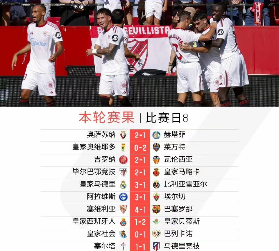 于无声处听惊雷!巴萨双线连败让出榜首。 西甲第8轮昨晚焦点大战,巴萨客场1:4惨败给塞维利亚。亚马尔伤停,上半场巴萨就处于绝对下风,塞维利亚2:0领先,还浪费一些机会。拉什福德破门完成西甲首球,可惜下半场莱万踢丢点球没能扳平。补时塞维利亚连进两球4:1大胜,巴萨遭遇新赛季西甲首败,加上周中欧冠的输球,双线两连败。这让落后皇马2分,让出榜首。此战又刷新多个纪录,15场客场不败被终结,10年来最大比分失利等等。 其余比赛中,马竞也1:1战平塞尔塔,而此前一直保持不败的黑马埃尔切1:3不敌阿拉维斯,这样随着巴萨和埃尔切的输球,西甲本赛季没有不败金身了。