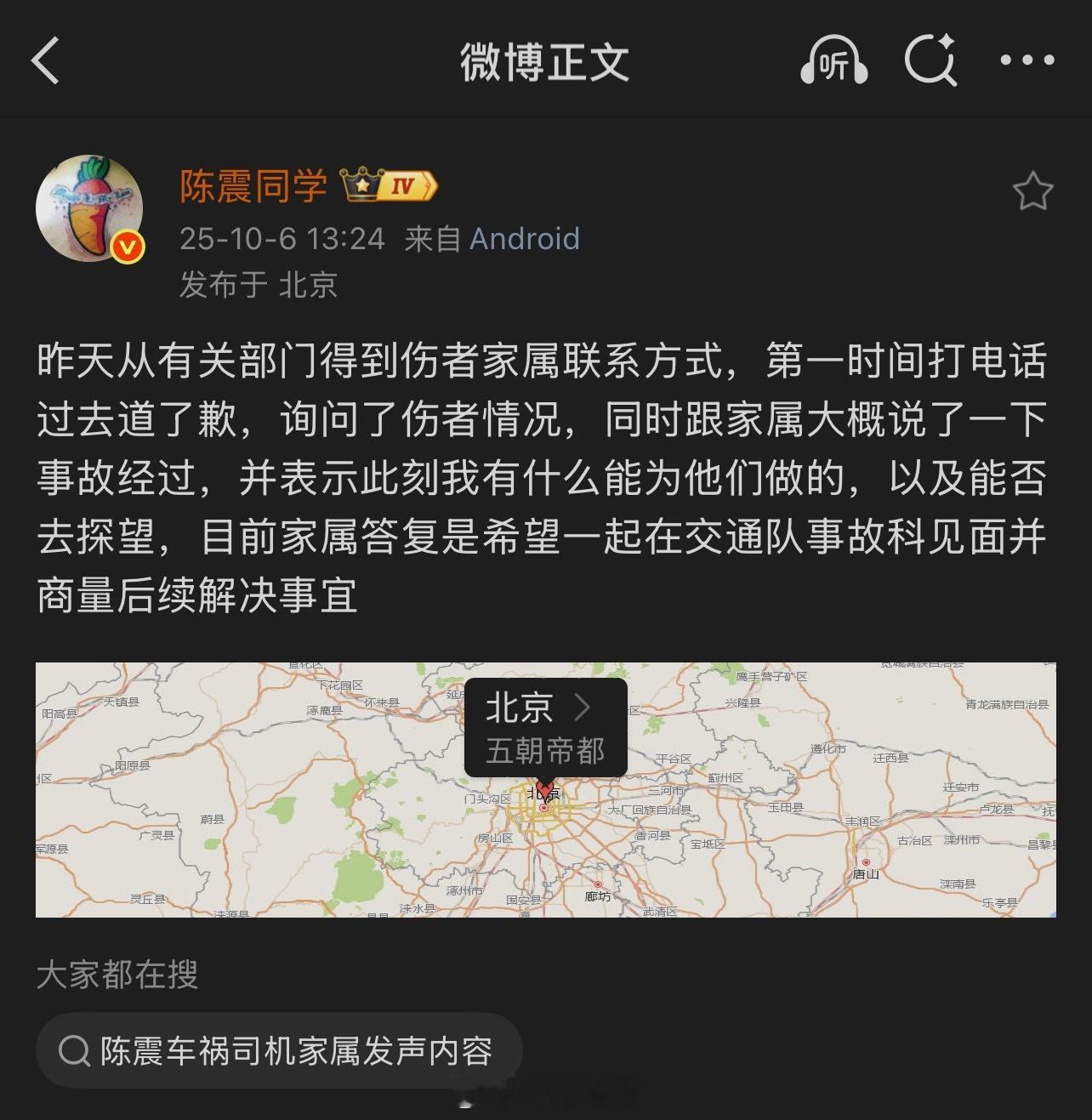 陈震刚又连发了两条关于事故的回应,一个是联系上了对方车辆的家属,并表达了去医院探望的意愿。