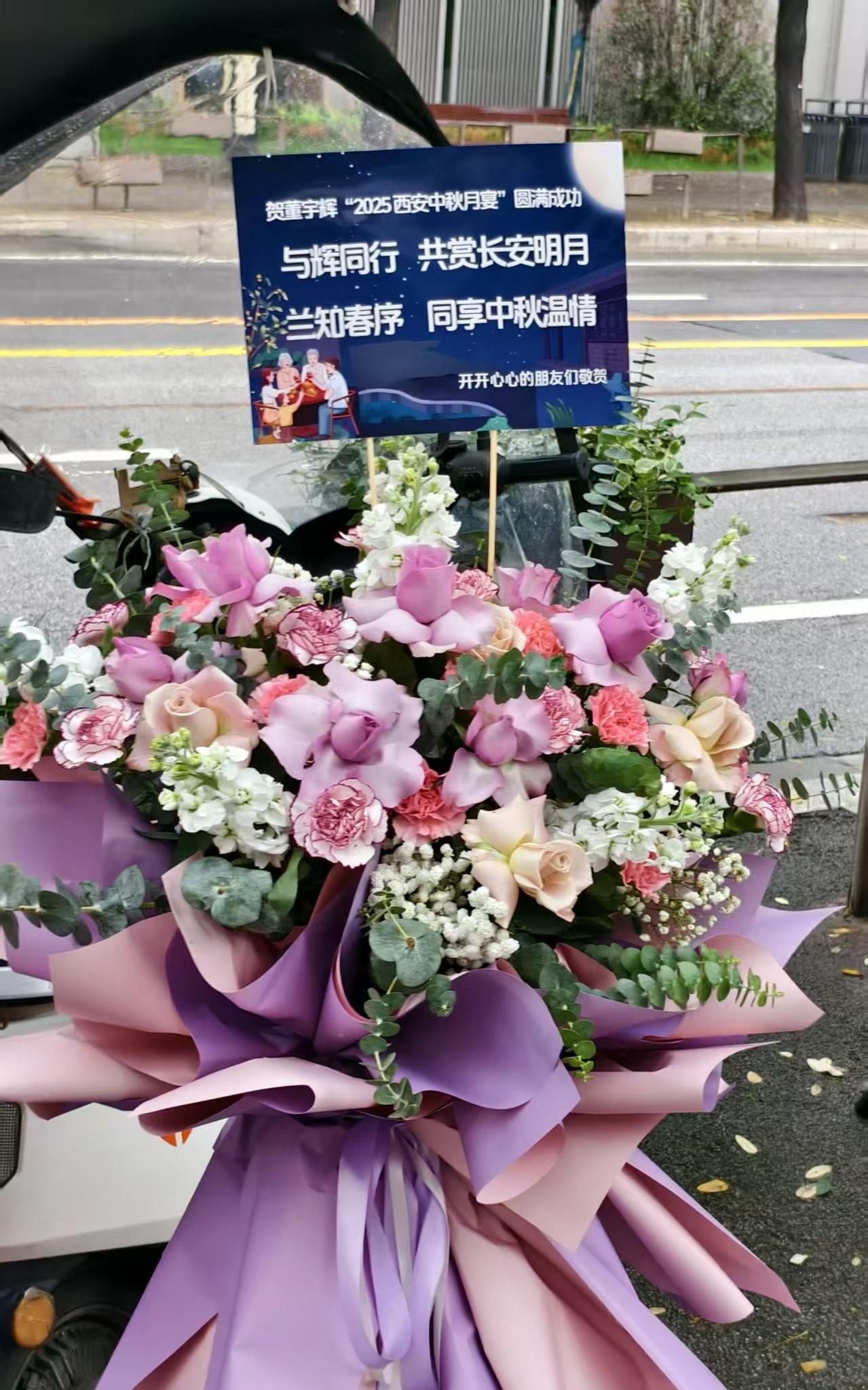 我们的花送到了,西安大唐西市酒店,我们热切期待今晚8点的中秋家宴。 今天陕西的演员白冰,孙浩,闫妮,张嘉译都给与辉同行发来了视频祝贺!陕西各路媒体都发了视频宣传,突然找到了央视的感觉。 现场也热闹起来了,各路鲜花都已经到位,各路人马也都感到了,平安喜乐,夏日来信,兰兮提花包对暗号,大家见面自觉相认。