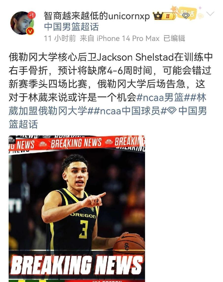 林葳迎来利好!俄勒冈大学核心后卫骨折 林葳前天才官宣加盟俄勒冈大学球队,很多媒体和球迷还在猜测林葳能不能成为球队的首发后卫,结果昨天该球队的主力后卫Jakson就发生了骨折,将要休战4-6周,也就是一个月到一个半月的样子。 虽然看着林葳队友受伤不应该高兴,这样有点不地道的,但是对于林葳来说,确实是个好消息,这样他很大概率有一个月以上的首发机会,有了这一个月的历练,打的好就可能坐稳了首发位置,不得不说林葳的运气还是很不错的,希望林葳能够抓住机会,利用这一个月完美展现出自己的实力,站稳这个首发位置,接下来再看看有没有机会继续冲击NBA,加油!