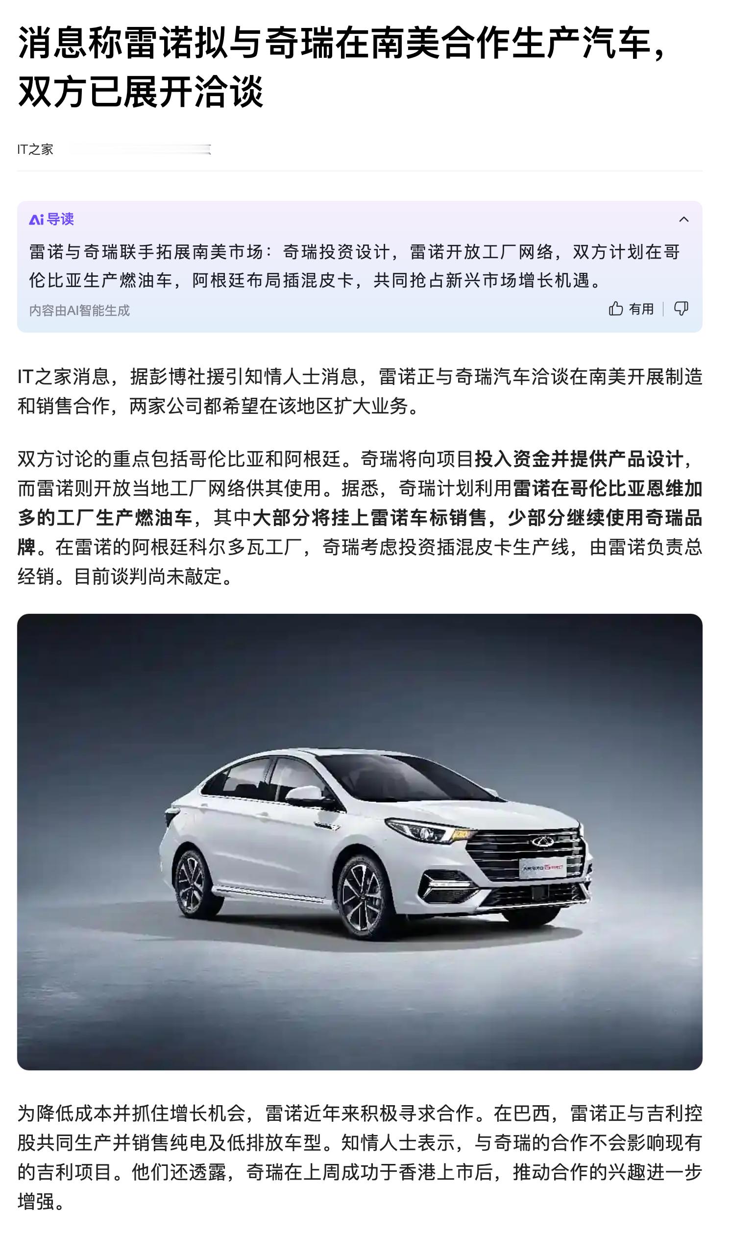 消息称雷诺拟与奇瑞在南美合作生产汽车,双方已展开洽谈。