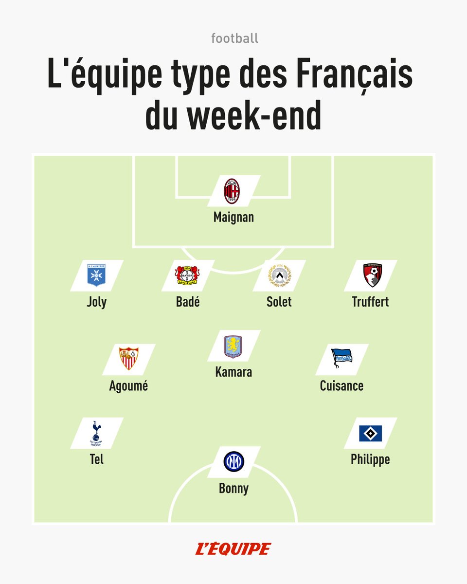 虎扑10月06日讯队报评选出了本周末五大联赛中法国球员最佳阵容:卡马拉表现出色,迈尼昂和博尼成为米兰王者