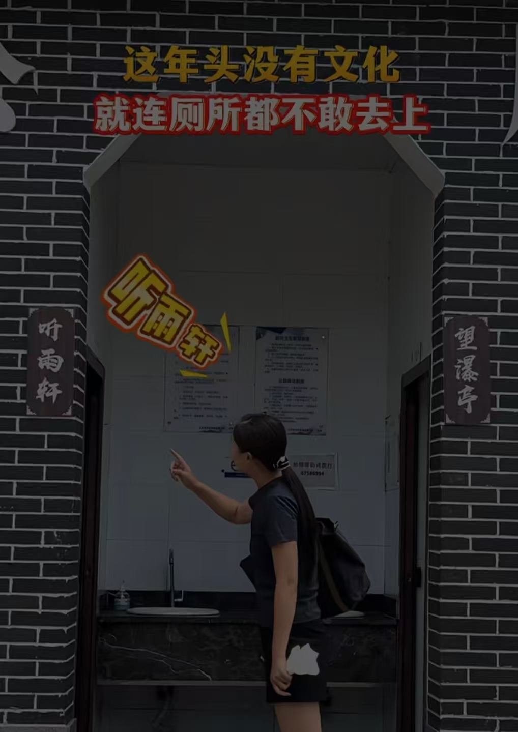 有网友一本正经地分析说,男人站着尿,那声音“哗啦哗啦”的,就跟听雨似的,所以“听雨轩”是男厕;女人尿的时候口子大,那水流就像瀑布一样,所以“望瀑亭”是女厕。
