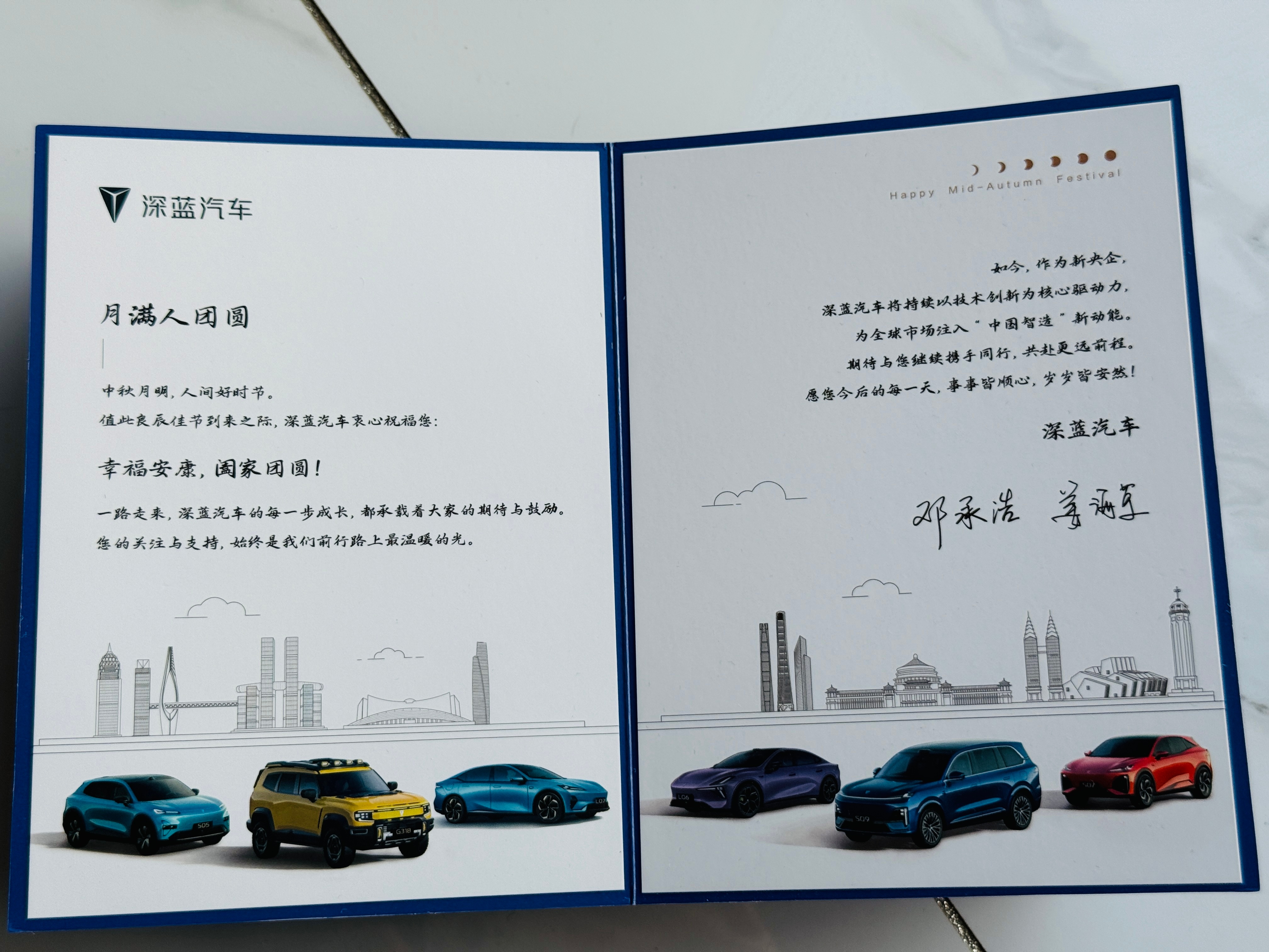 开心,收到了深蓝汽车邓乘浩(邓工)和姜海荣(海荣哥)2位领导中秋节祝福[送花花][送花花][送花花]