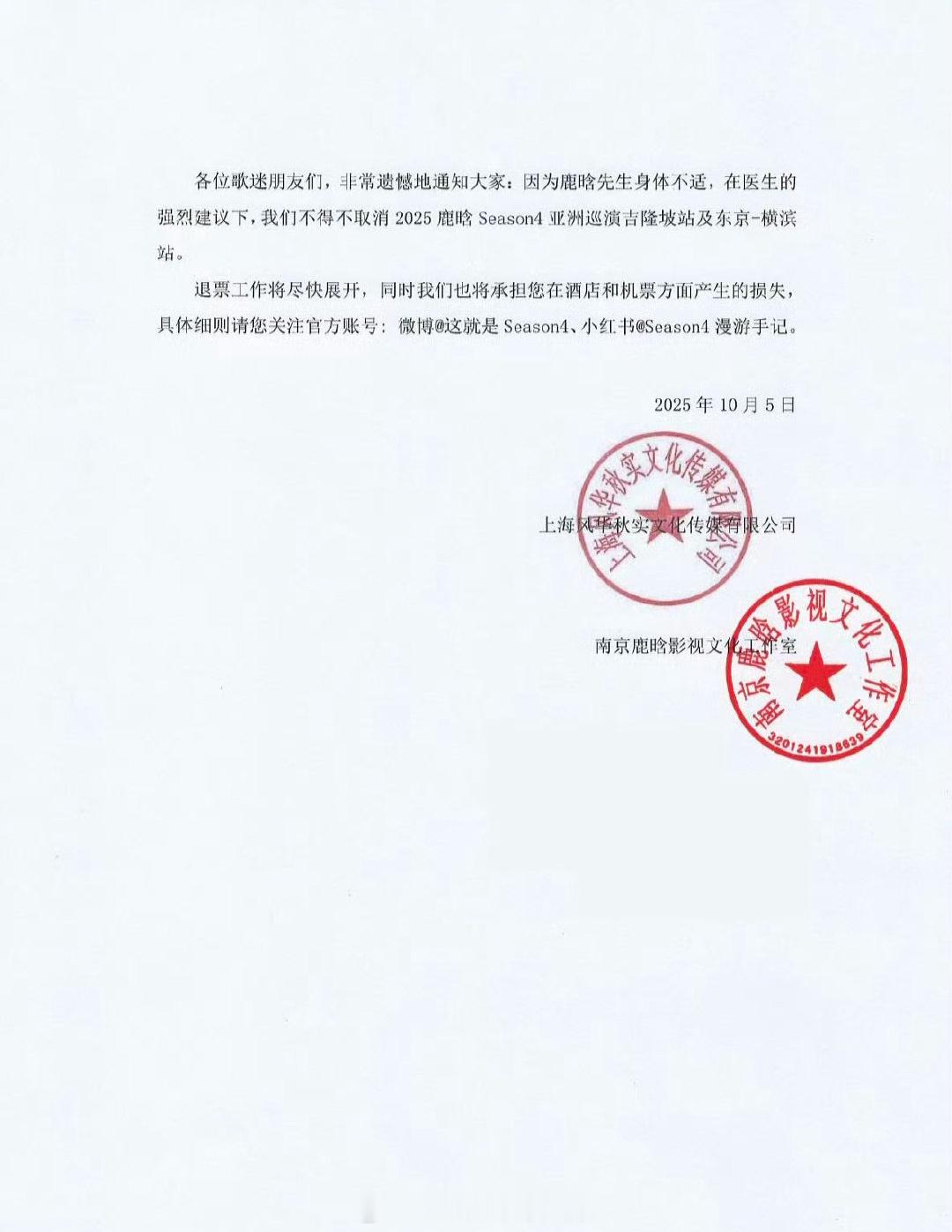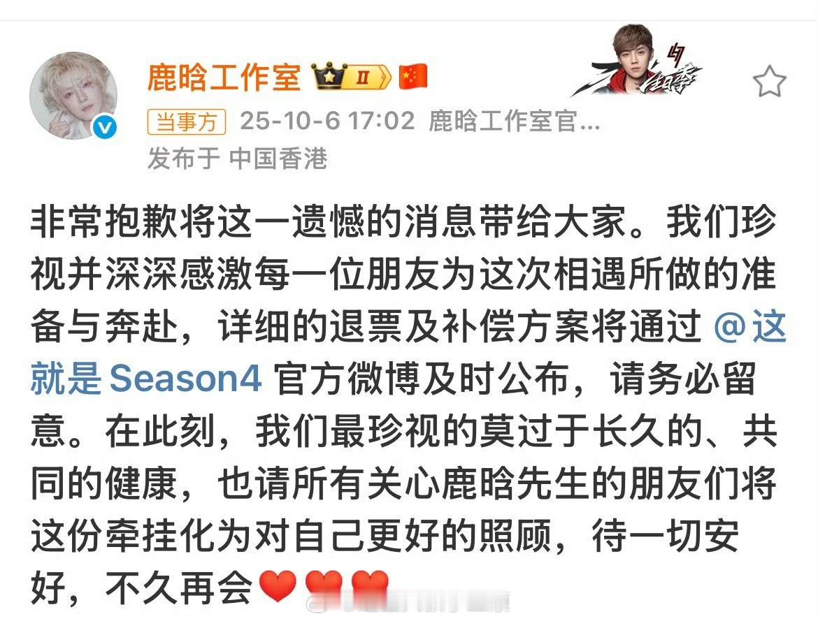 鹿晗吉隆坡站横滨站演出取消鹿晗好好啊,主动帮粉丝补偿损失,早日康复,下次再见!