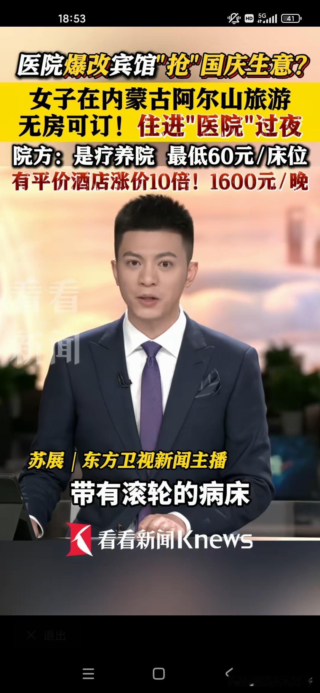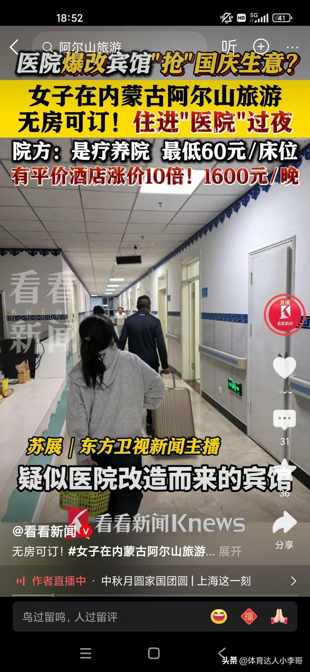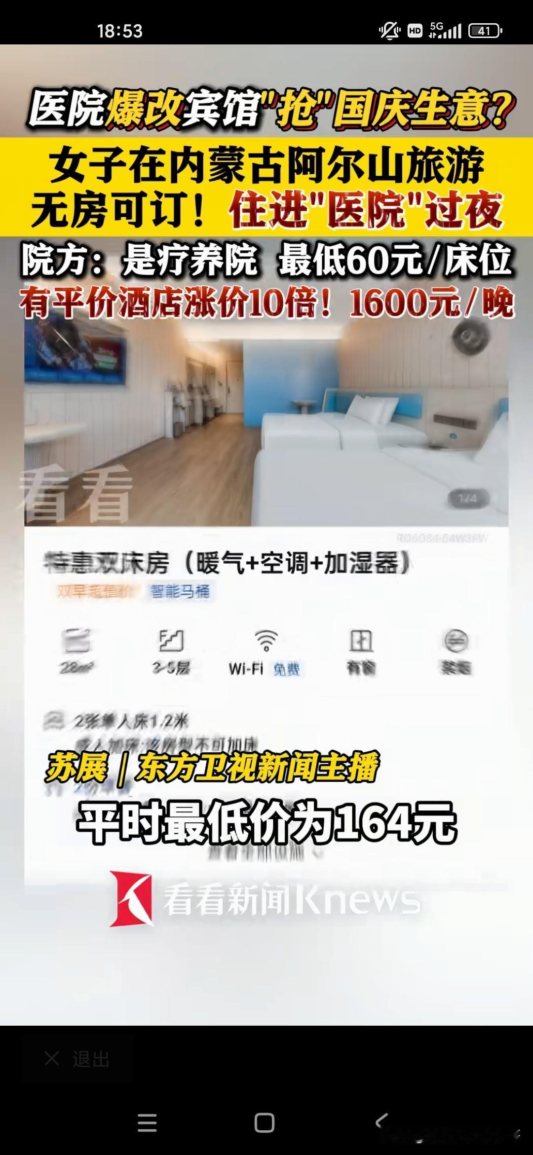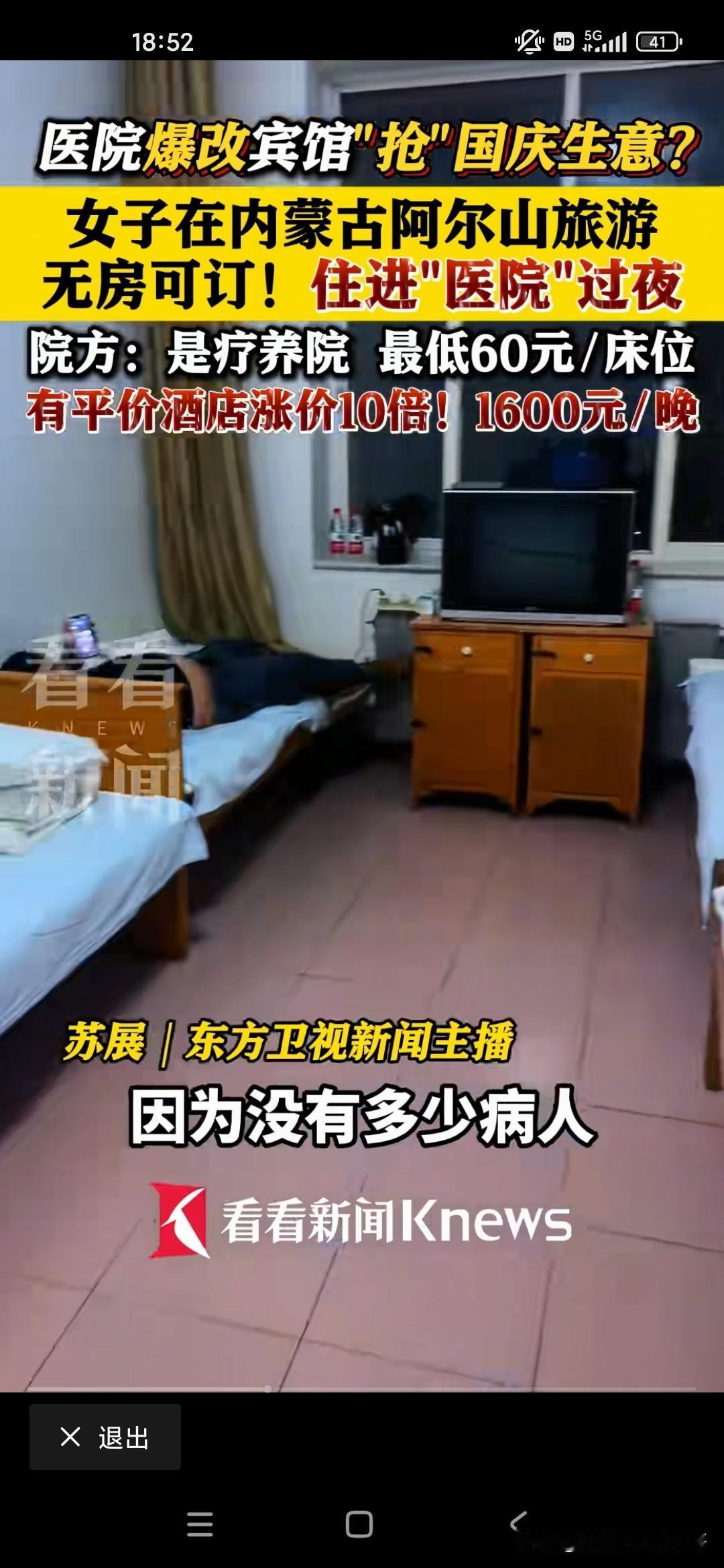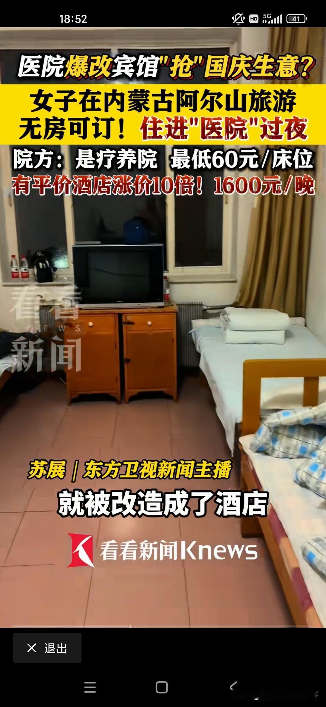 真的是没有想到国庆期间连医院都抢酒店的生意,因为酒店的价格太贵了,去内蒙古金山旅游的一个女生因为没有订到酒店的床位,就定了一个康复治疗中心的,结果发现导航到酒店的位置一看是医院的康复科,医院的工作人员回复说因为现在病人也不是说特别多,所以说有多余的床位,然后的话就所以说就把它改造成宾馆模式,也是有独立的标准间,也有多人间,看顾客个人的选择,很多不想被资本收割的,或者脑子比较灵活的时候就选择了这个康复疗养中心,价格也比较便宜,一般三四百块钱,大部分人还可以接受!