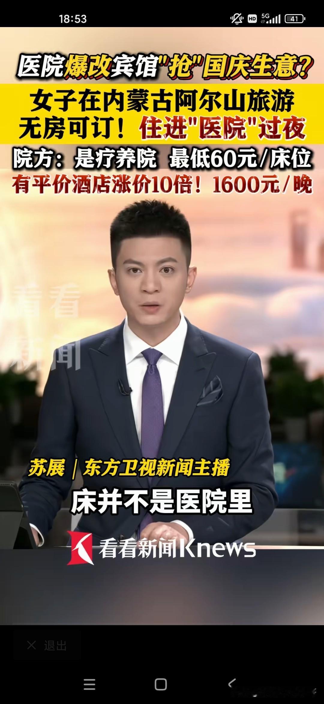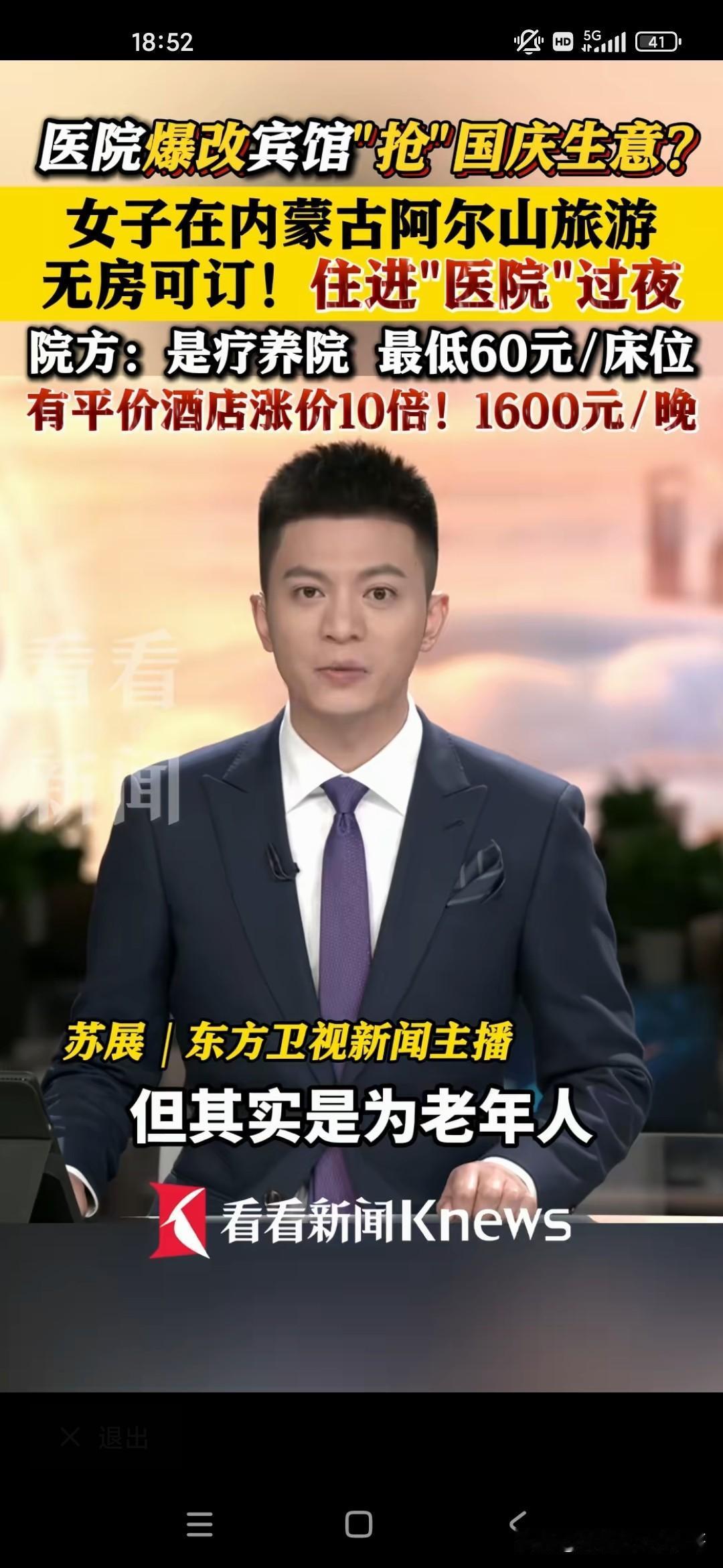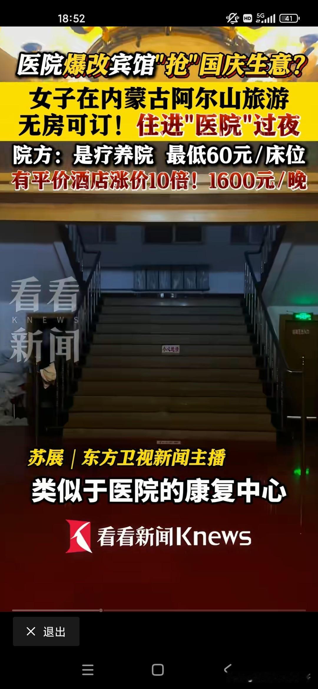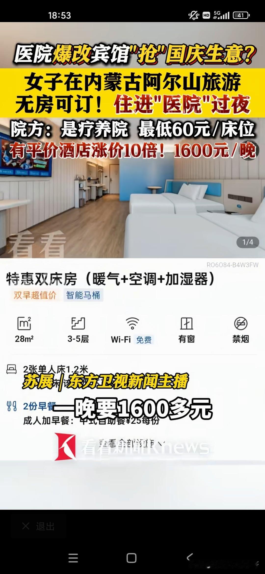 真的是没有想到国庆期间连医院都抢酒店的生意,因为酒店的价格太贵了,去内蒙古金山旅游的一个女生因为没有订到酒店的床位,就定了一个康复治疗中心的,结果发现导航到酒店的位置一看是医院的康复科,医院的工作人员回复说因为现在病人也不是说特别多,所以说有多余的床位,然后的话就所以说就把它改造成宾馆模式,也是有独立的标准间,也有多人间,看顾客个人的选择,很多不想被资本收割的,或者脑子比较灵活的时候就选择了这个康复疗养中心,价格也比较便宜,一般三四百块钱,大部分人还可以接受!