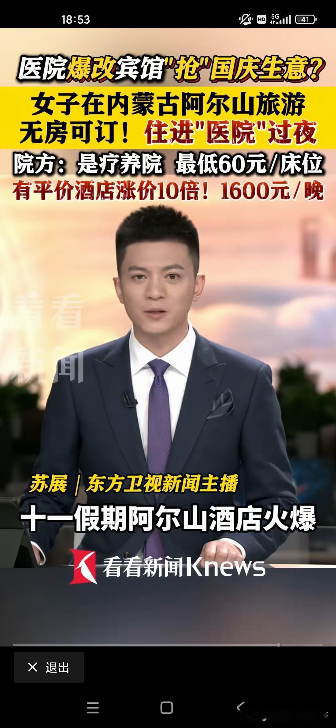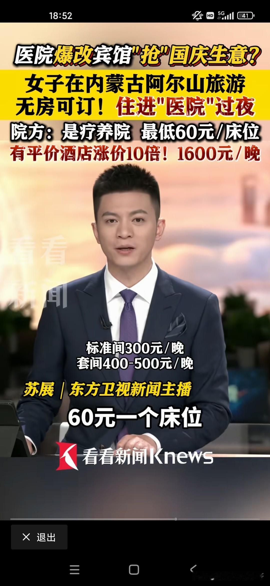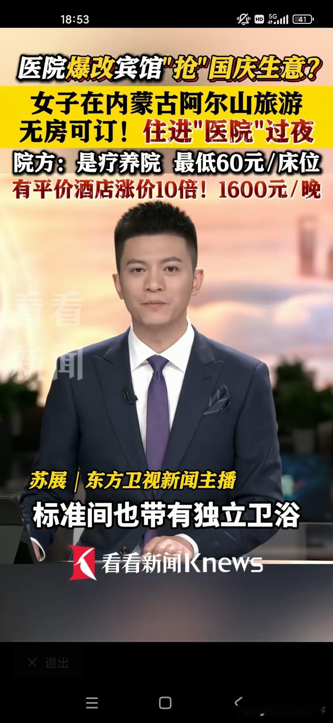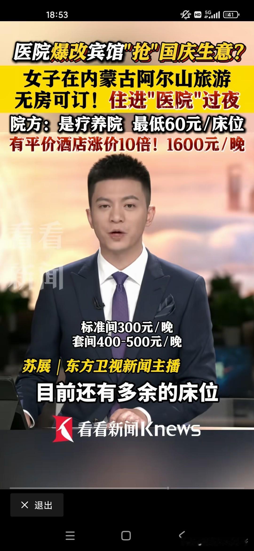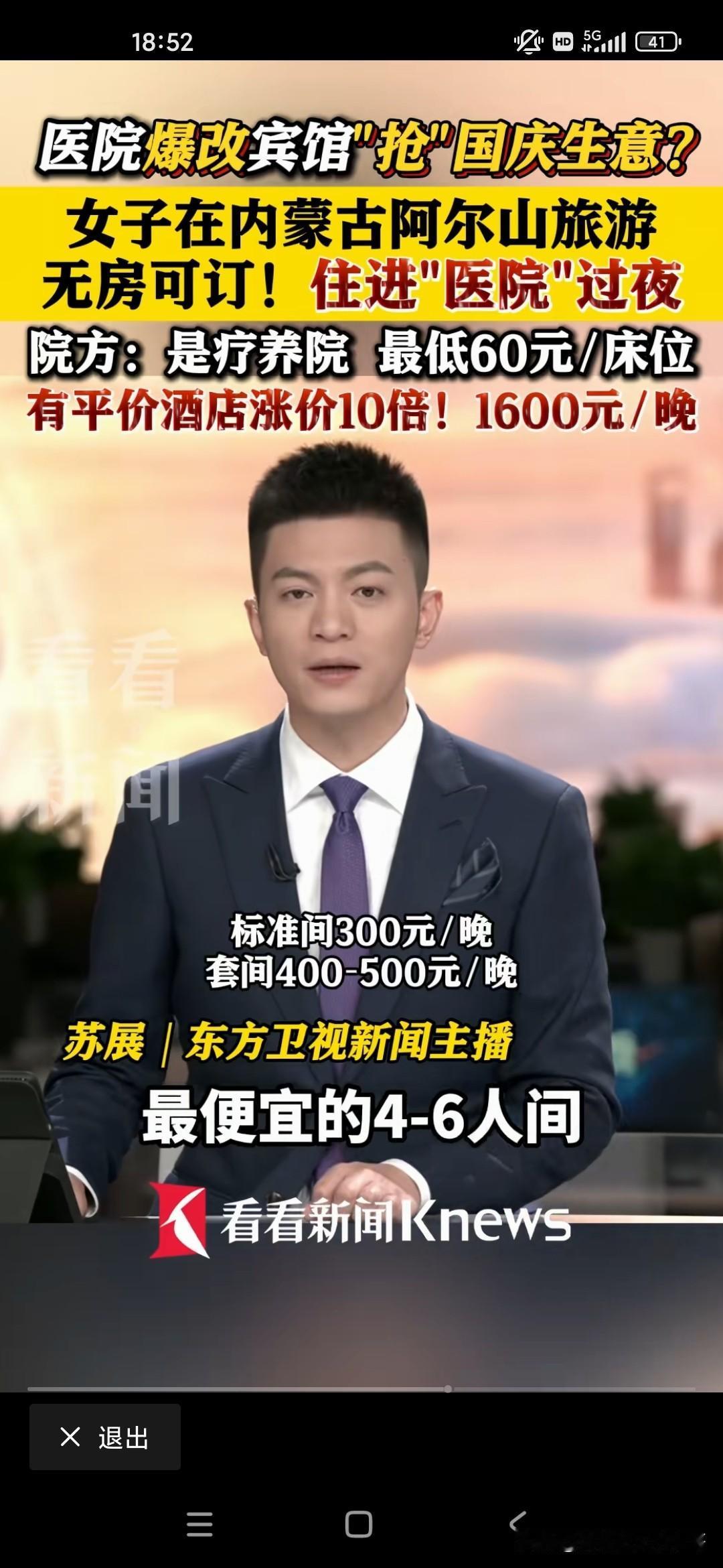 真的是没有想到国庆期间连医院都抢酒店的生意,因为酒店的价格太贵了,去内蒙古金山旅游的一个女生因为没有订到酒店的床位,就定了一个康复治疗中心的,结果发现导航到酒店的位置一看是医院的康复科,医院的工作人员回复说因为现在病人也不是说特别多,所以说有多余的床位,然后的话就所以说就把它改造成宾馆模式,也是有独立的标准间,也有多人间,看顾客个人的选择,很多不想被资本收割的,或者脑子比较灵活的时候就选择了这个康复疗养中心,价格也比较便宜,一般三四百块钱,大部分人还可以接受!