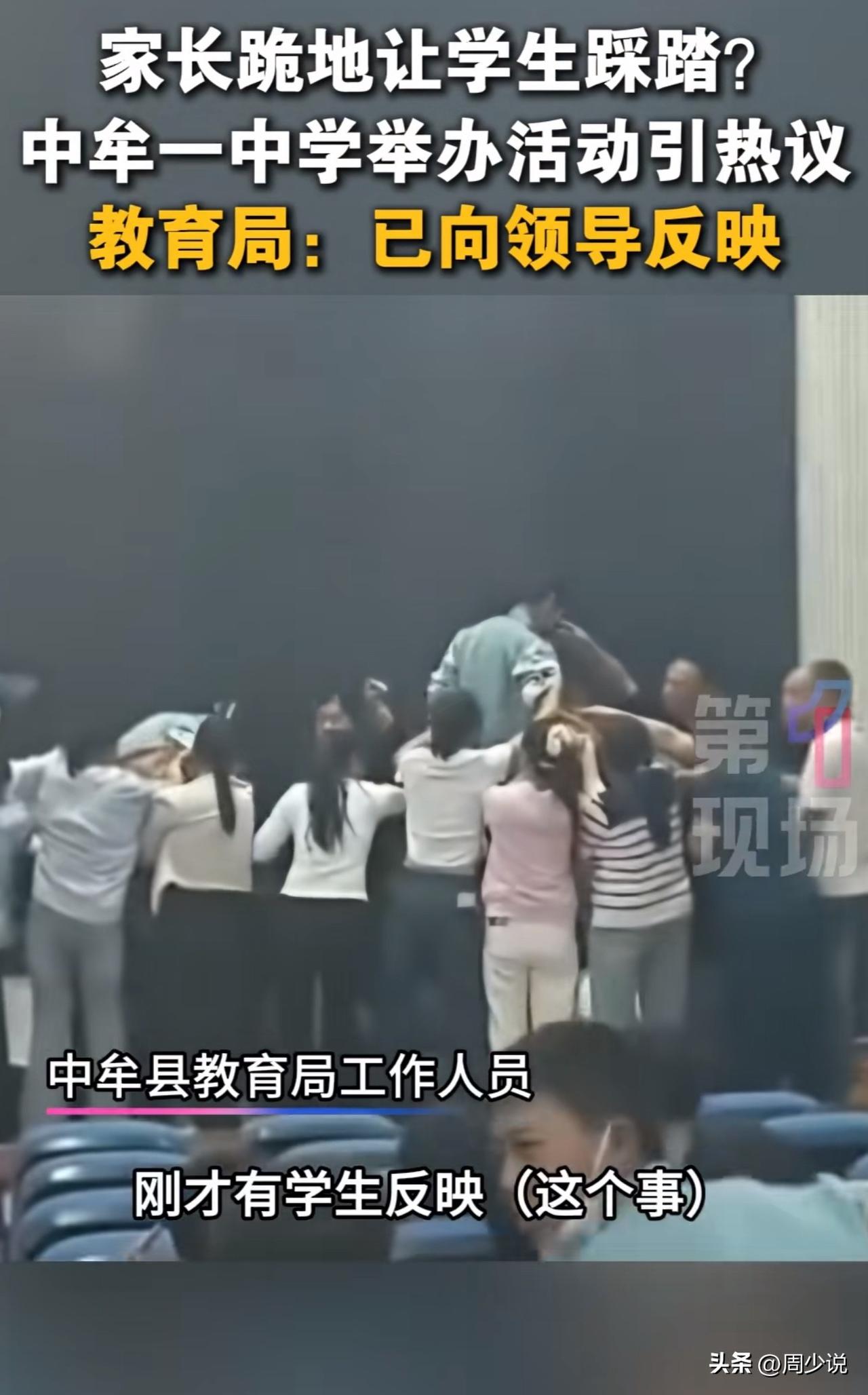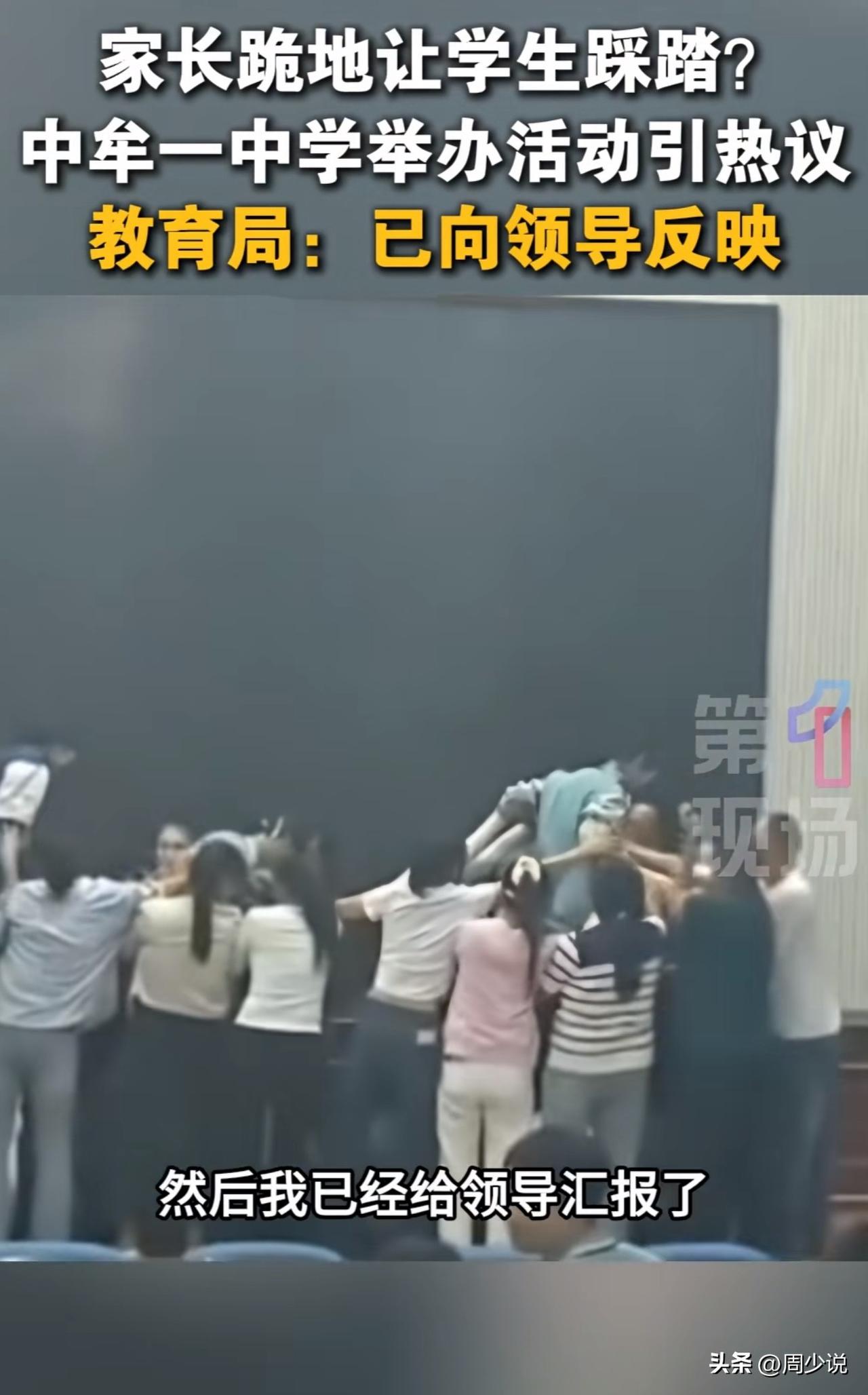 中学活动引争议:家长跪地供学生踩踏?教育局回应了! 近日,河南郑州中牟县一中学的活动视频引发轩然大波。视频中,大量家长跪地,学生疑似在活动环节中依次从家长身上踩踏越过,这一场景曝光后迅速点燃网络热议。 中牟县教育局工作人员针对此事回应称,“已收到学生投诉,相关情况已向领导反映,后续处理进展暂未公布。” 网友对此看法两极:有网友怒斥“这是对家长的不尊重,传递错误价值观”; 也有网友猜测“可能是活动形式被误解,或许有特殊教育意义但方式欠妥”; 还有网友呼吁“尽快查清真相,给家长和公众一个合理说法”。 这事在周少看来,教育的核心是教会孩子尊重与感恩,可郑州这所中学的活动,显然与这一初衷背道而驰。即便有特殊教育目的,让家长跪地供孩子踩踏的形式,也早已突破了情感和伦理的底线。 这种方式不仅不会让学生学会感恩,反而可能误导他们轻视父母的付出,扭曲对“尊重”的认知。教育局及时介入值得肯定,但更关键的是要查清活动设计初衷,明确这种不当形式的危害。 大家觉得这种活动形式合理吗?#长沙新朋友# #寻美三湘#