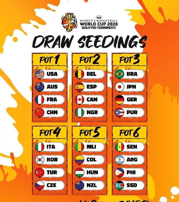 2026女篮世界杯资格赛分档出炉:中国高居第一档! 北京时间10月6日,FIBA国际篮联公布了2026女篮世界杯资格赛球队分档出炉,美国、澳大利亚、法国和中国位列第一档!具体分档如下: 第一档:美国、澳大利亚、法国、中国 第二档:比利时、西班牙、加拿大、尼日利亚 第三档:巴西、日本、德国、葡萄牙 第四档:意大利、韩国、土耳其、捷克 第五档:马里、哥伦比亚、匈牙利、新西兰 第六档:塞内加尔、阿根廷、菲律宾、斯洛文尼亚