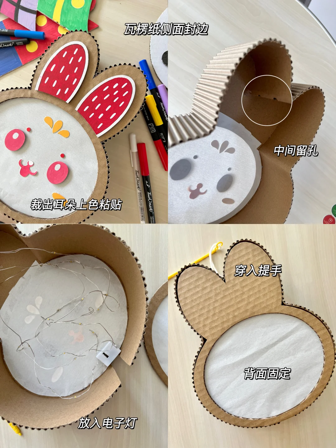 中秋节快到啦~ 教大家用快递纸箱做个兔子灯笼!有手就会超简单~ ✂️用到的材料:废纸皮、美工刀、热熔胶、电子灯、宣纸或硫酸纸、丙烯马克笔、高光笔、绳 具体步骤可以参考👀上面个图示噢~