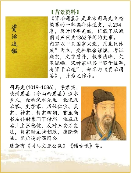 《资治通鉴》是北宋司马光主持编纂的一部编年体通史,共294卷,历时19年完成,记载了从战国到五代共1362年间的史事。