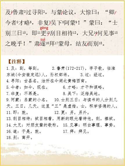 等到鲁肃经过寻阳,和吕蒙谈论事情时,(鲁肃)非常惊讶地说:“以你现在的才干和谋略来看,你已经不再是原来那个吴地的吕蒙了!”吕蒙说:“与读书的人分别几天,就要另外用新的眼光看持他,兄长怎么对这个事理明白得这么晚呢!”鲁肃于是拜见吕蒙的母亲,与吕蒙结为朋友后才分别。