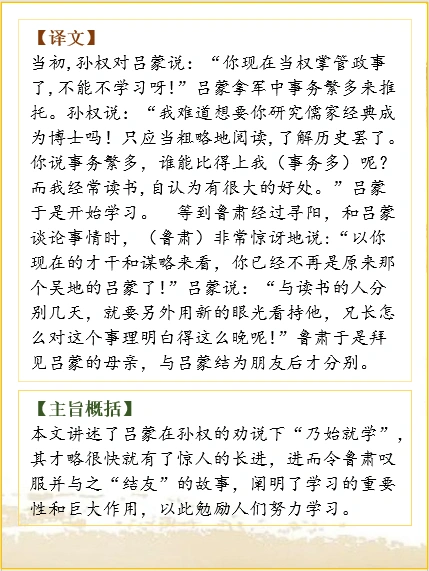当初,孙权对吕蒙说:“你现在当权掌管政事了,不能不学习呀!”吕蒙拿军中事务繁多来推托。孙权说:“我难道想要你研究儒家经典成为博士吗!只应当粗略地阅读,了解历史罢了。你说事务繁多,谁能比得上我(事务多)呢?而我经常读书,自认为有很大的好处。”吕蒙于是开始学习。