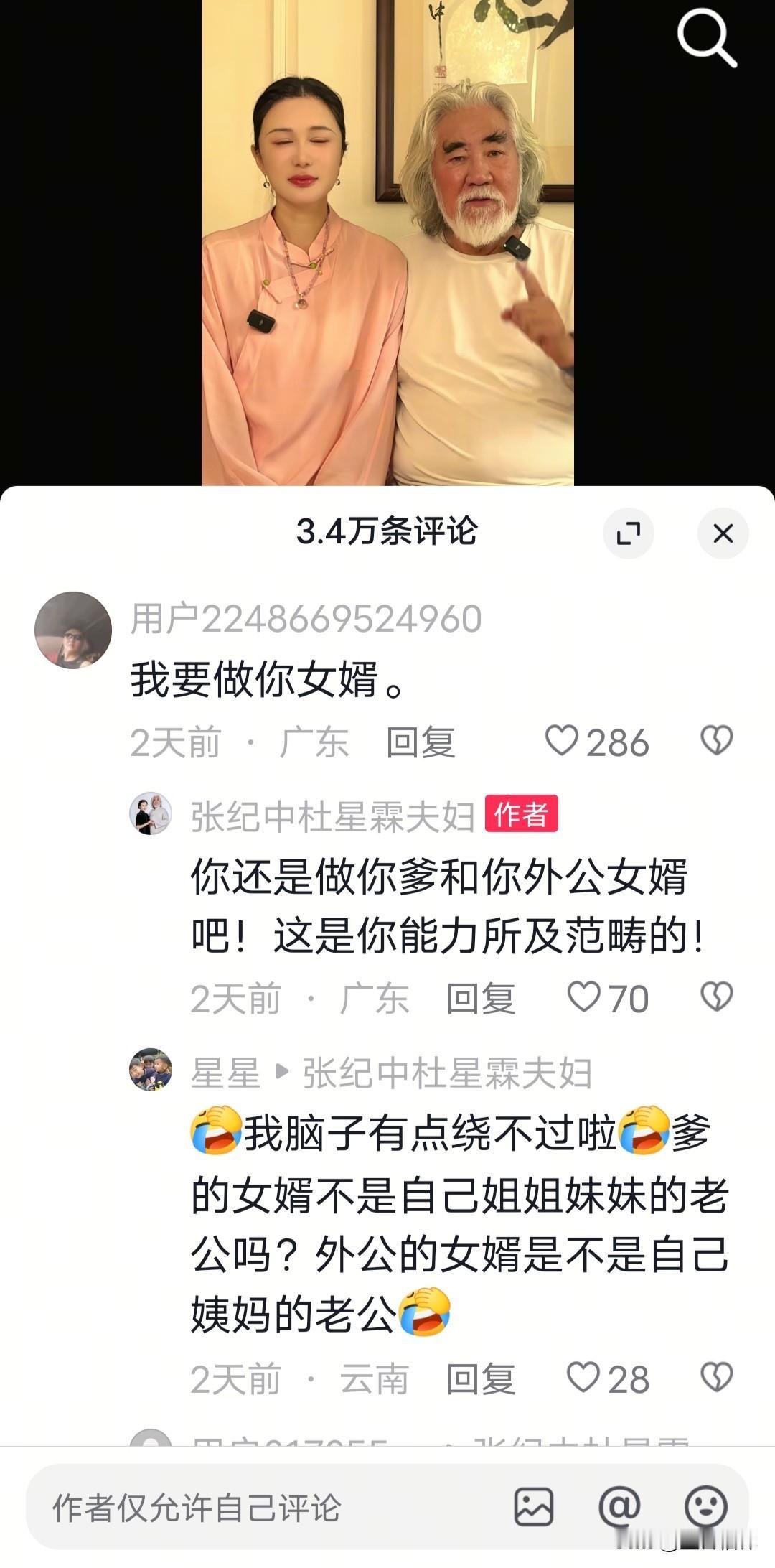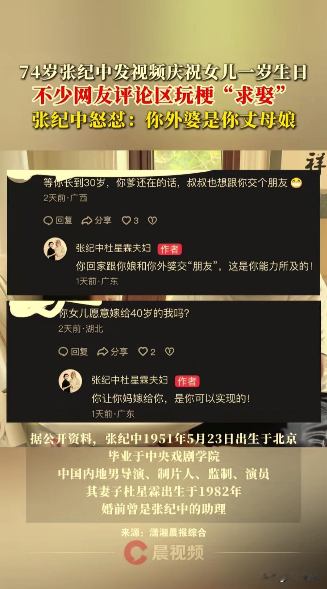 74岁的张纪中和43岁的老婆杜星霖发视频祝女儿一岁生日快乐,评论区不少网友们玩梗“求娶”,说想做他女婿,张纪中怒怼网友。 近日张纪中导演夫妇在社交平台上发布了一段为小女儿“小龙珠”庆祝一岁生日的视频。 为孩子送上了寄语:爸爸会用足够的生命经验去挖掘你的擅长,你如果没有擅长,我们就托举你完成你的热爱…… 部分网友评论区玩起了梗,留下了“我要做你的女婿”之类的求娶的评论,有网友表示“我要做你的女婿”,张纪中回应到:“你还是做你爹和你外公的女婿吧”。 张纪中 杜星霖 张纪中带娃日常 张纪中女儿