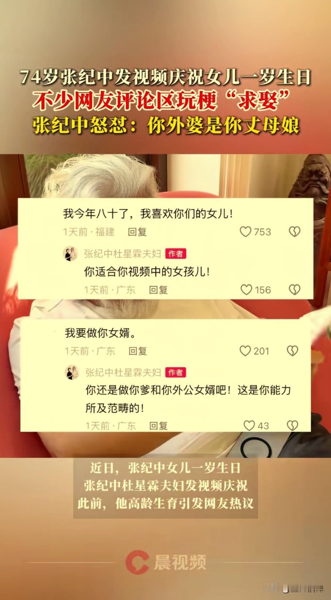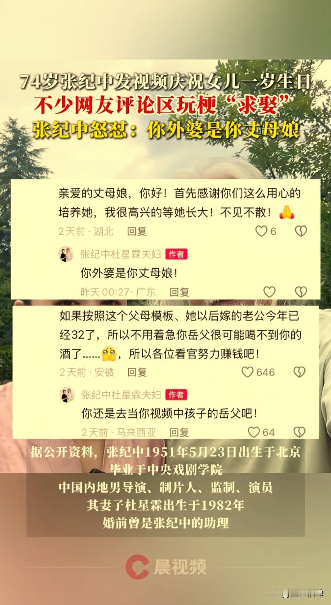 74岁的张纪中和43岁的老婆杜星霖发视频祝女儿一岁生日快乐,评论区不少网友们玩梗