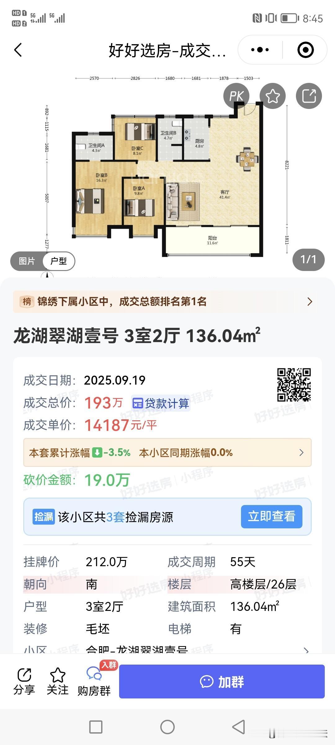 合肥最新的一些次新热门小区二手房成交的情况。 经开区的龙湖翠湖壹号,单价一万四。