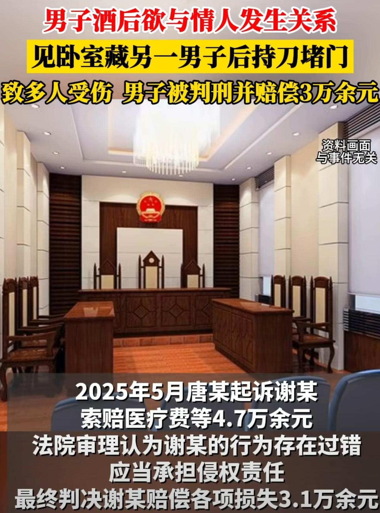 男子喝酒后想找情人发生关系,给情人打电话,却听到对方电话里有其他男人的声音,男子直接找上门,发现男人藏在卧室,要求开门被拒绝,最后砍伤情人和男人。法院:判1年2个月 湖南,54岁的男子和48岁的女子是情人关系,去年2月,男子喝了酒,想去找女子发生关系,打电话时隐约听到女子那边有别的男人声音,立马起了疑心,直接往女子家赶。 到了女子家,男子猜到卧室里藏了人,让女子开门,女子不肯,两人吵了起来。 之后男子越想越气,搬了凳子堵在门口,还从厨房拿了把菜刀威胁女子,自己坐在门口边喝酒边守着。 熬到凌晨4点多,女子实在怕了,偷偷给堂哥打电话求救。半小时后堂哥赶到,女子趁机要开门,男子直接冲进去,砍伤了女子。 卧室里藏着的男人听到呼救声,赶紧开门出来,最后也被男子砍伤了头和面部。 事后,男子因故意伤害罪被判1年2个月。今年5月,女子又把男子告上法院,要求赔偿医疗费等损失,最终法院判男子赔3.1万。 有网友觉得女子一边维系情人关系,一边又藏别的男人,是纠纷的导火索,感情里拎不清。 但也有网友认为,不管女子感情上多不妥,男子伤人就是错的,她作为受害者索赔合理,不能因为她有道德争议就否定她的合法权益。