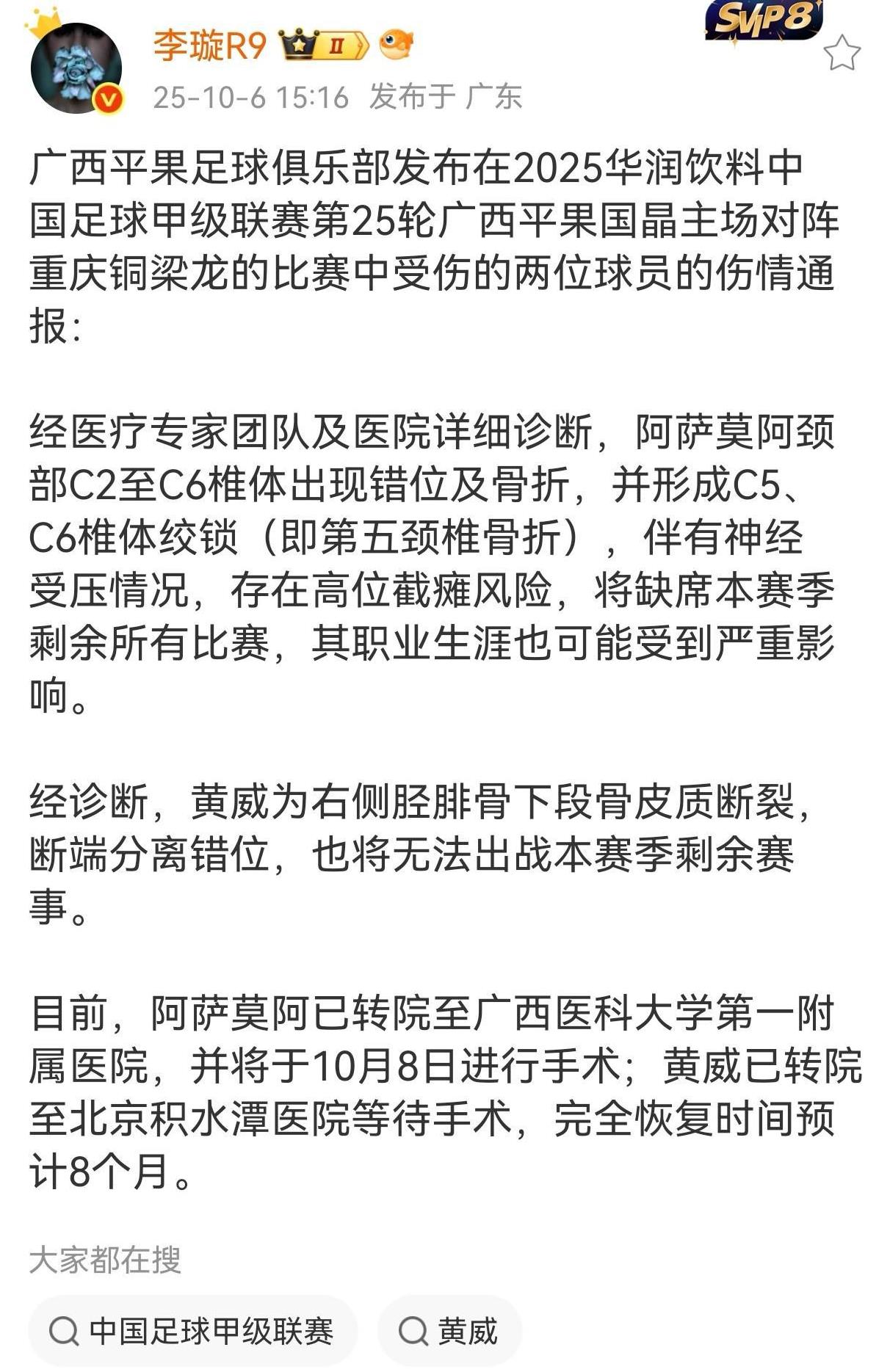 10月5日,在中甲广西平果与重庆铜梁龙的比赛中,广西外援阿萨莫阿被铜梁龙球员张志雄撞上广告牌,致阿萨莫阿C2至C6颈椎骨折。 这可是颈椎损伤里的重灾区。C2到C6段骨折易压迫脊髓,一旦神经损伤不可逆,高位截瘫风险极高。 目前,阿萨莫阿已转院至广西医科大学第一附属医院,并将于10月8日进行手术;及时减压是降低瘫痪风险的关键,祈祷他能挺过这关! 经纪人@金畅指莫阿阿被伤的原因是场地广告牌的放置不合理。 不管咋说,球场设施的合理摆放、球员的自我保护意识都是非常重要的!