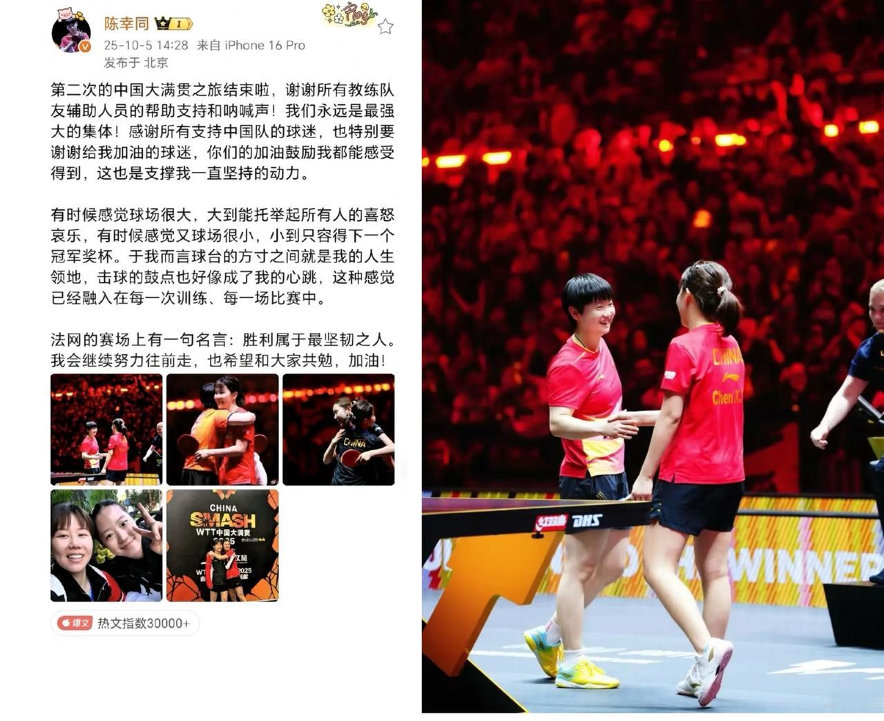 陈幸同发文感慨中国大满贯赛结束,言语中富有深意,似有所指。平台为此开启评论精选功能,不对外公开所有评论! 球场很大,能装下所有人的喜怒哀乐;球场也很小,最终只容得下一个冠军。 陈幸同的这句话,看似在感叹胜负,实则是在提醒我们:竞技的本质是自我超越,而不是互相消耗。 当平台开启“评论精选”,这是在保护运动员,也是在保护我们共同的观赛环境。 真正的强大,不是把对手踩在脚下,而是在尊重中不断变强。你是怎么喜欢孙颖莎的 你认为王曼昱和孙颖莎谁实力更强