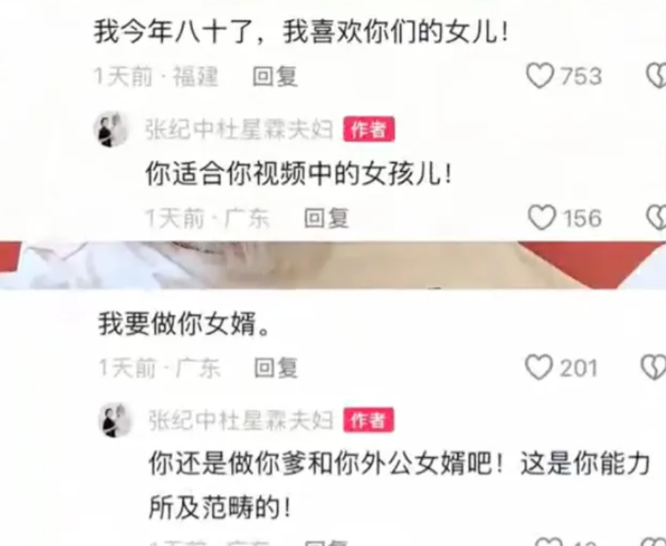 74岁张纪中发视频庆祝女儿1岁生日,遭网友玩梗“求娶”,张纪中公开怒怼:你外婆是你丈母娘 近日,知名导演、制片人张纪中发视频庆祝女儿一岁生日,但不少网友在评论区留言“求娶”,相关留言随后被张纪中怒怼。 其中有网友表示“我要做你女婿”,张纪中回应“你还是做你爹和你外公女婿吧”,网友称其妻子为“丈母娘”,张纪中怒怼“你外婆是你丈母娘”。 公开资料显示,张纪中出生于1951年5月,系国内知名导演、制片人,曾翻拍过许多金庸先生的经典小说,曾担任《笑傲江湖》《天龙八部》《神雕侠侣》《射雕英雄传》等制片人。 张纪中的现任妻子杜星霖出生于1982年,是其第三任妻子,婚前曾是他的助理。2024年10月,杜星霖为张纪中生下两人第四个孩子。