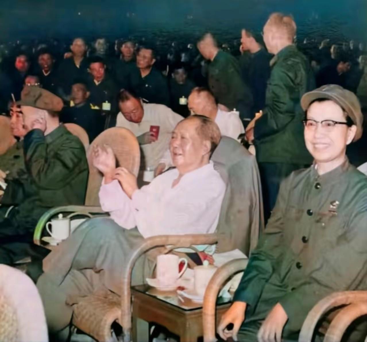 这是毛主席罕见的照片!老照片 从照片看,坐在藤椅上的毛主席,应该是在观看样板剧。 由于表演很精彩,毛主席不但聚精会神的看,还伸出双手鼓掌呢。 就是坐在毛主席左边的江同志,也是笑意盈盈。 那么,坐在毛主席右手边那个人,又会是谁呢?欢迎大家留言。