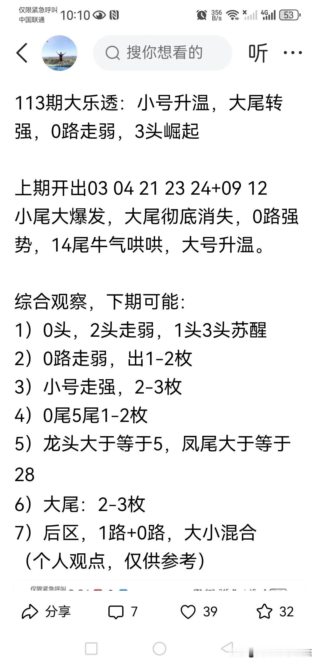 节后第一期开奖,预测再次成功,除了后区和龙头,又是全对! 本期大号大码做主,但整体开始向小码倾斜,尾号大小正常轮动,大概率下期继续向小号倾斜,小尾反攻。